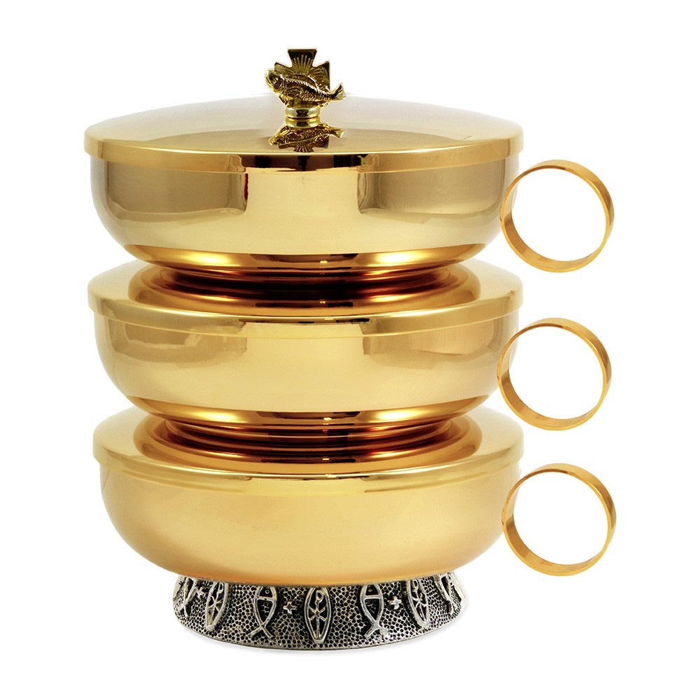 La pisside a tre piani è realizzata in ottone dorato lucido 24k con tre anelli e base decorata con finitura argento antico.