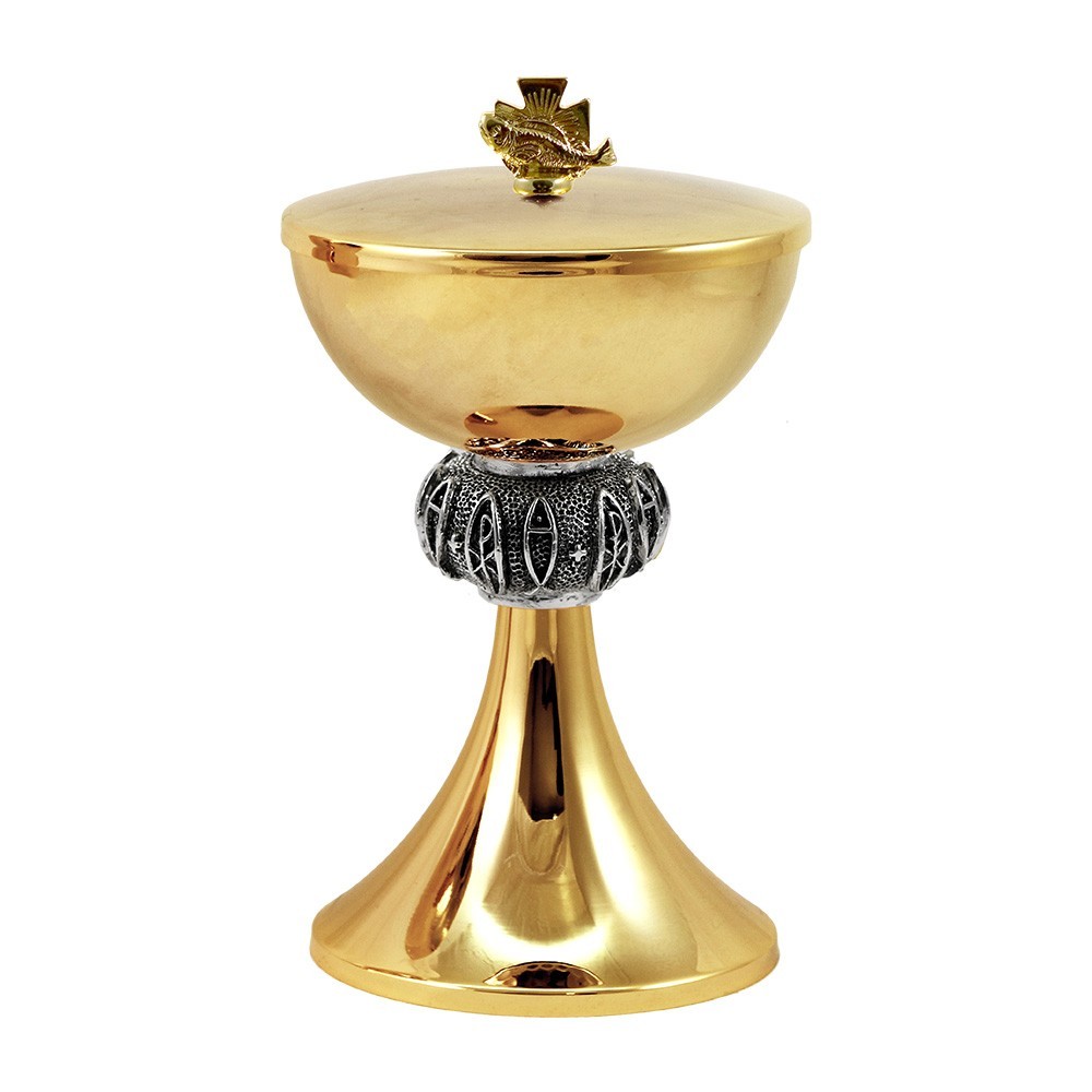 Pisside liturgica realizzata interamente in ottone dorato garantito 24 carati, con particolare nodo decorato con pesci e Croce PX.