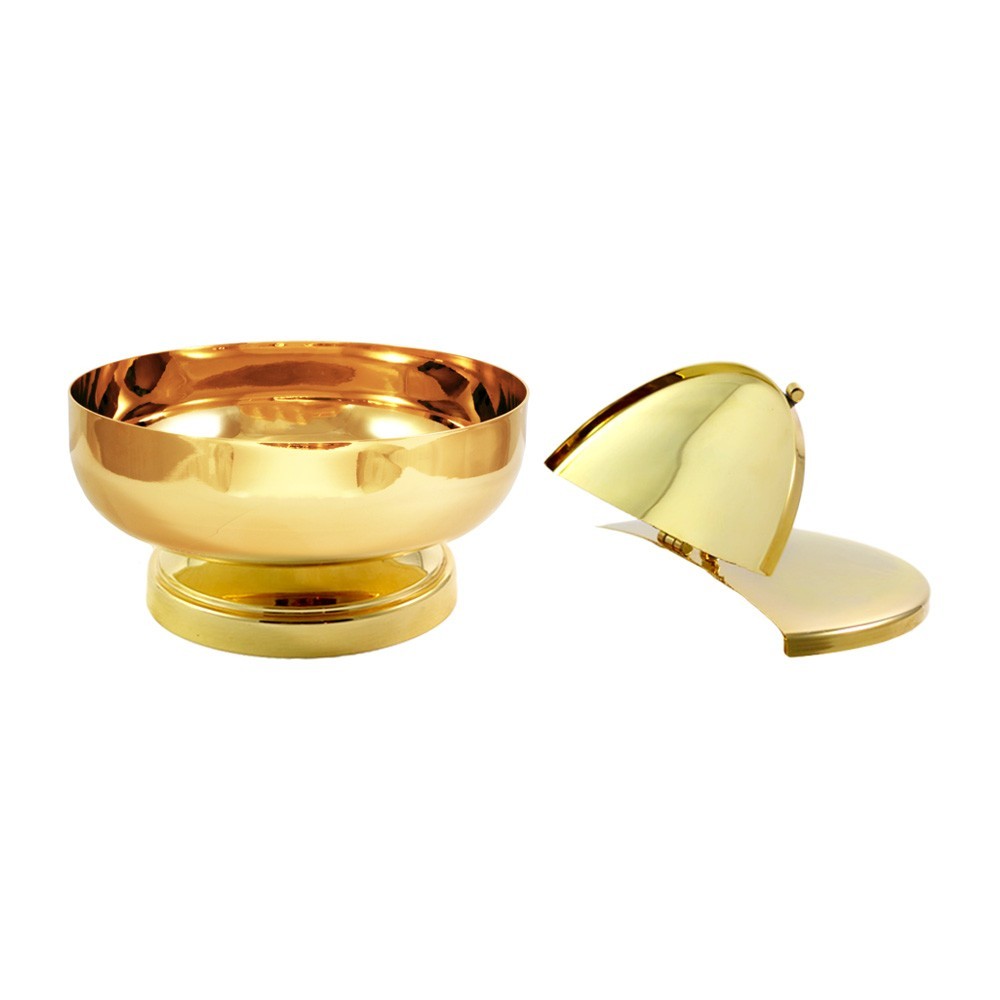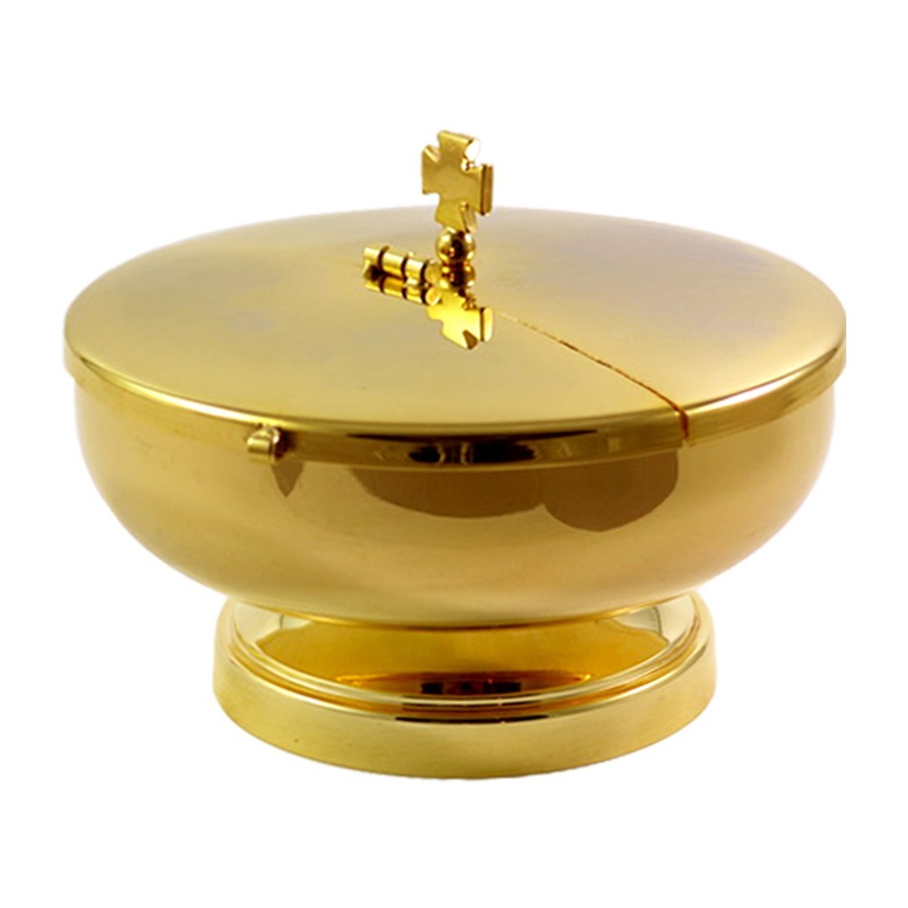 Pisside in ottone dorato con doratura garantita 24 carati. La base è semi apribile, mentre il coperchio è completamente removibile.