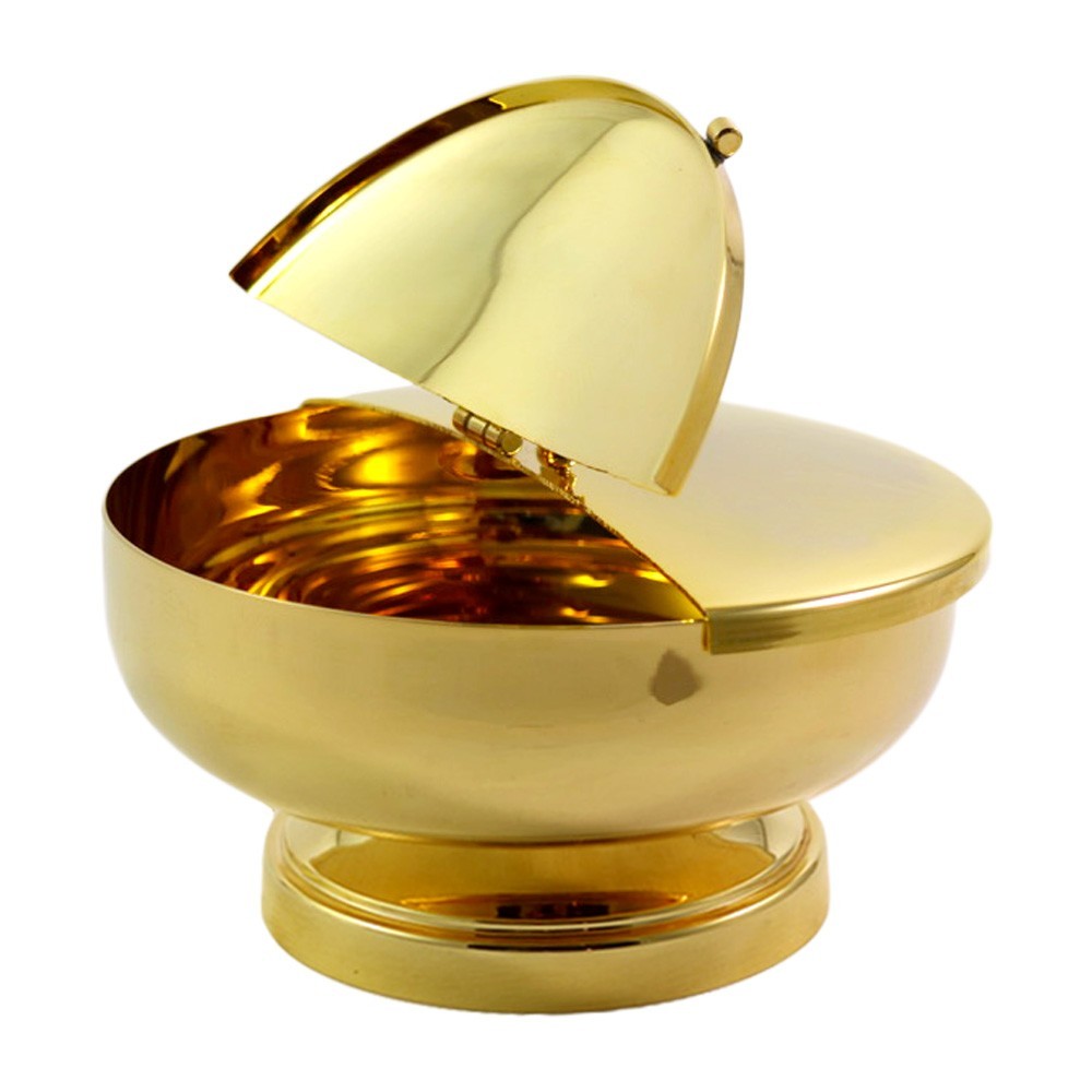 Pisside liturgica con base e coperchio semi-apribile.