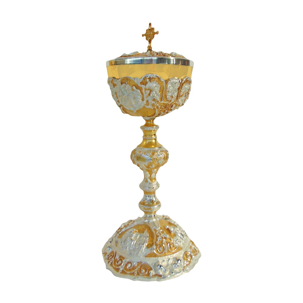 Pisside liturgica di altissima qualità realizzata in stile barocco, in fusione bicolore lucido e ossidato.