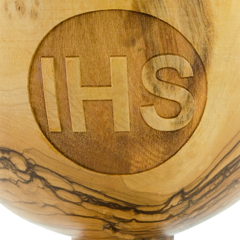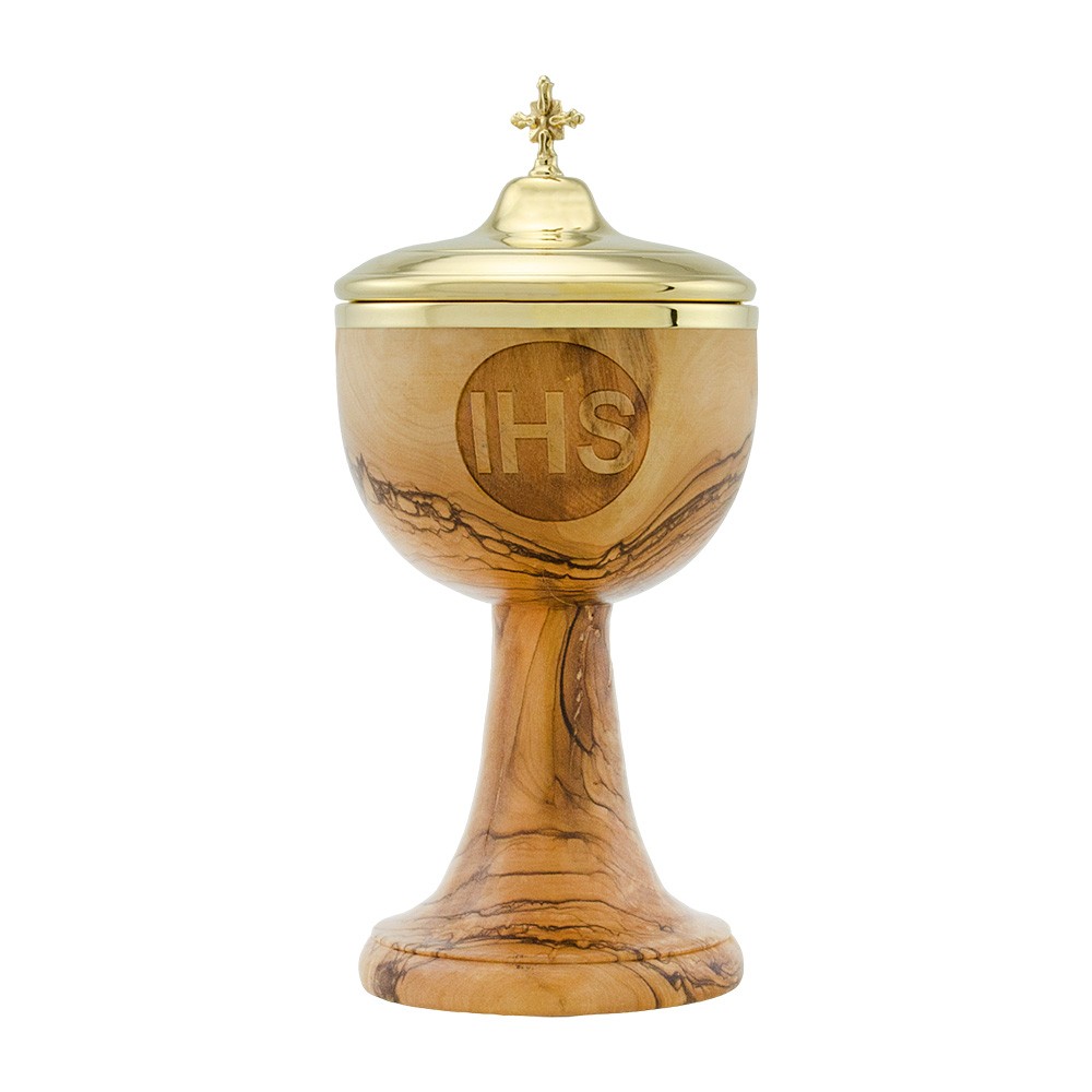 La pisside è alto 25 cm ed è realizzata in legno di ulivo con incisione IHS e interno coppa in argento 800.