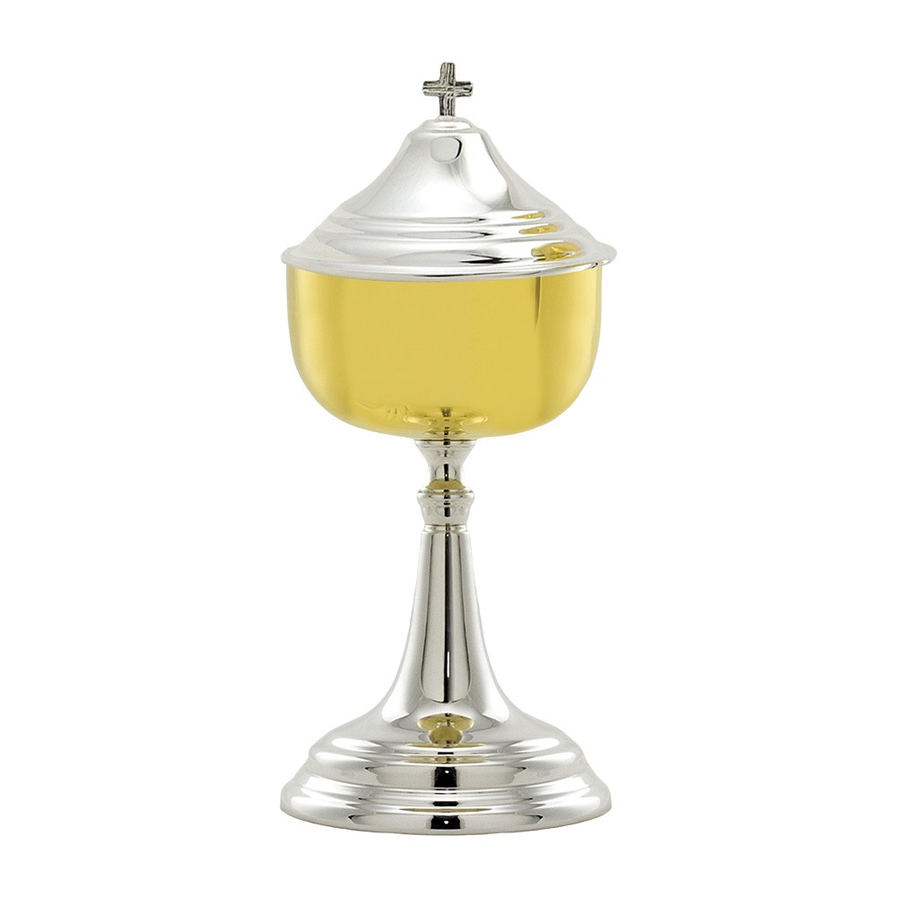 Pisside liturgica con croce argentata, h 22 cm.