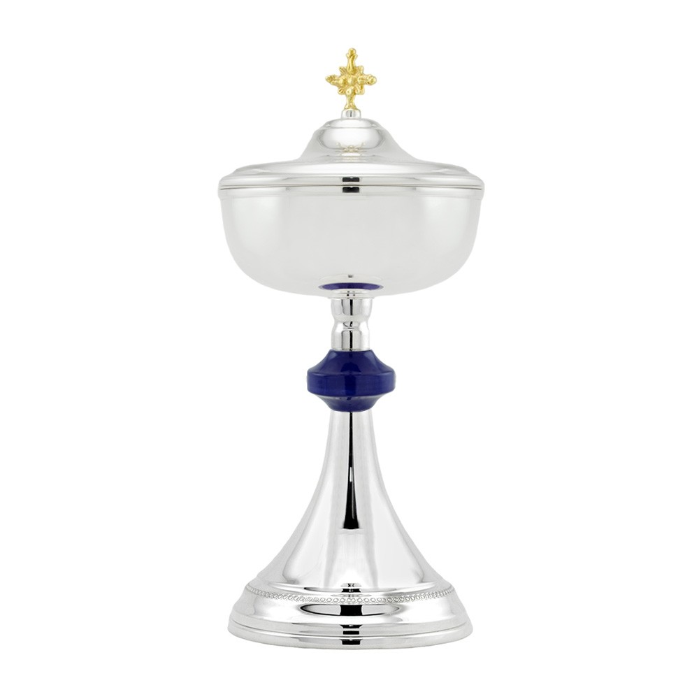 L'interno della pisside è in bagno oro 24k, è alta 29 cm e il diametro della coppa misura 13 cm. Peso 520 gr.