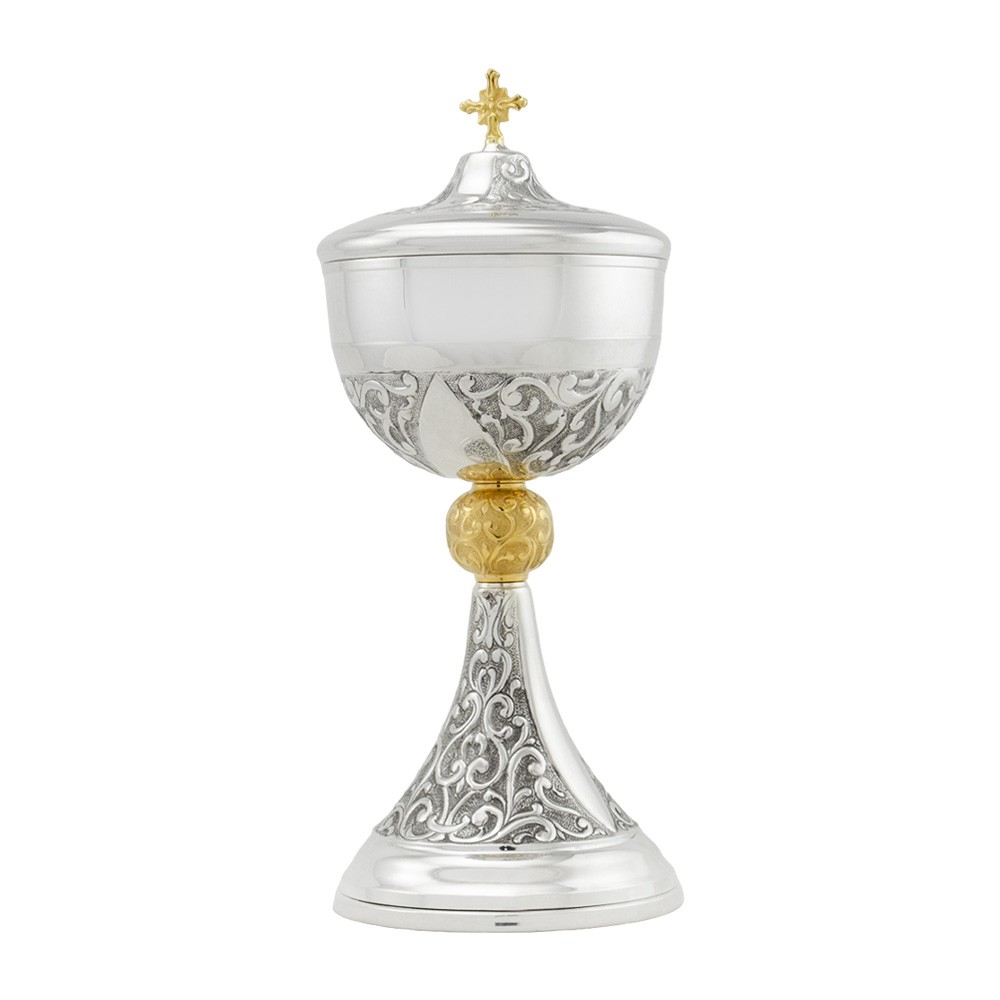 Le ricche decorazioni presenti sulla pisside sono accuratamente eseguiti a mano, garantendo e donando alla pisside eleganza e unicità al pezzo.