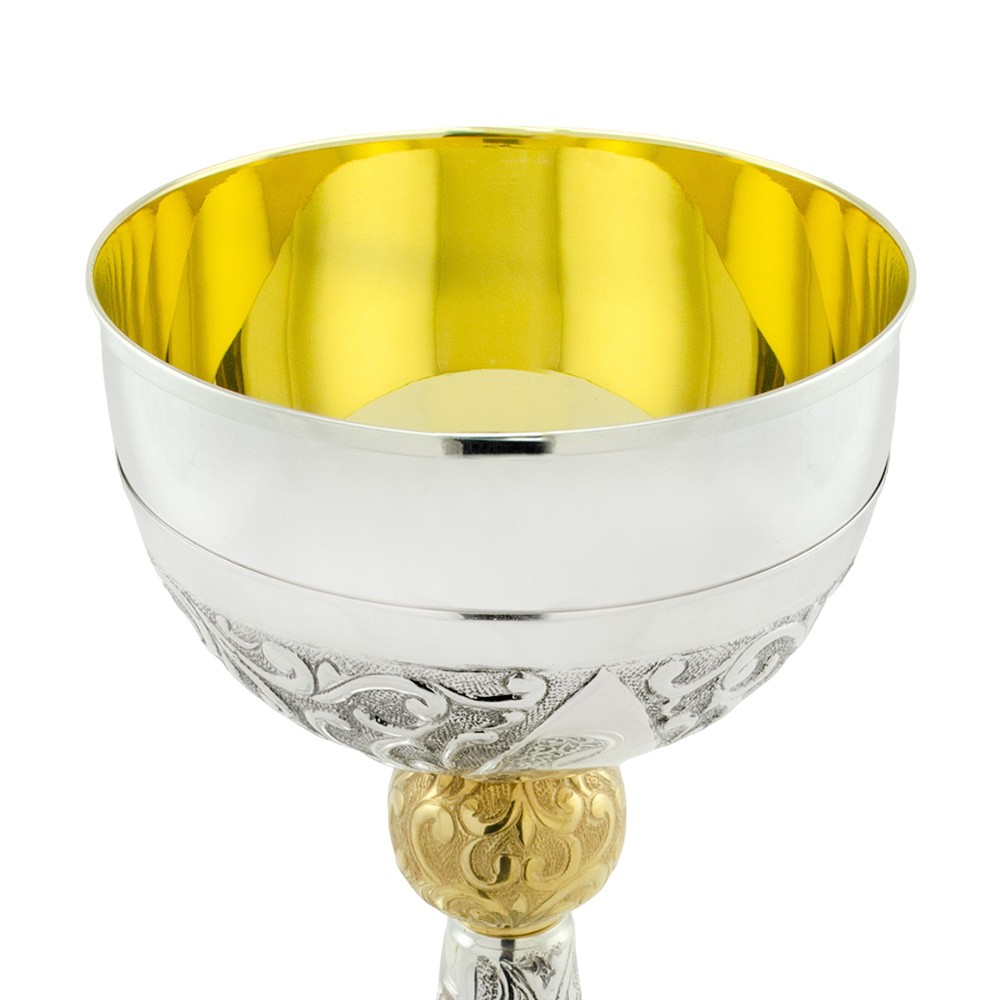 Set calice e pisside in ottone bicolore con nodo in fusione con decori.