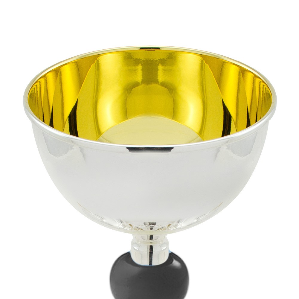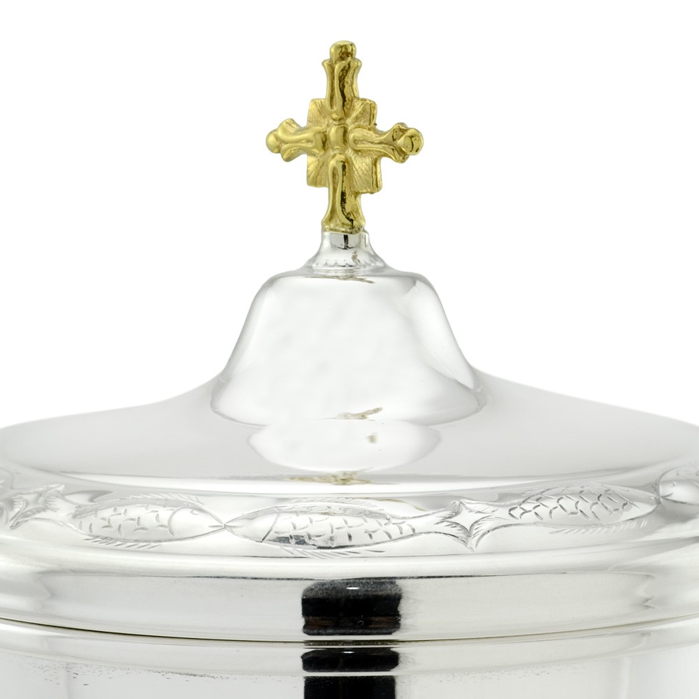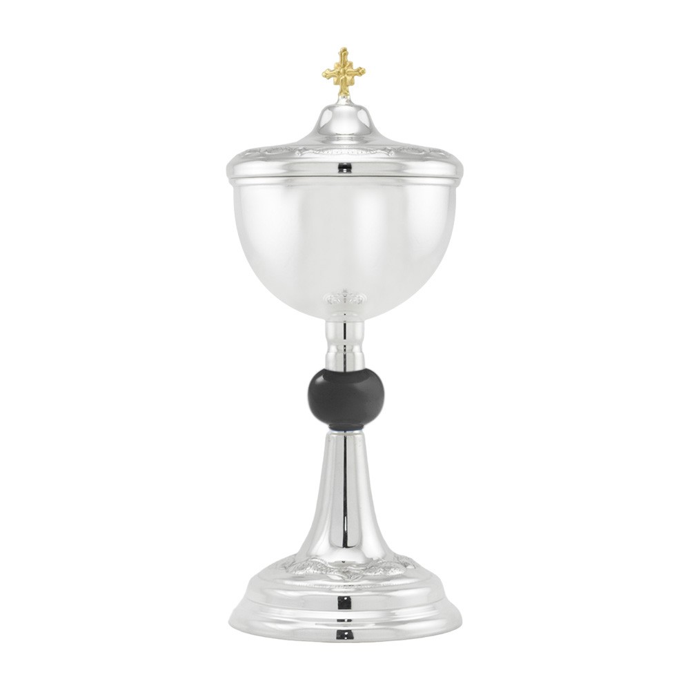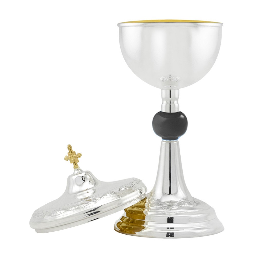 Pisside liturgica modello "Delfino" realizzata in argento 800 con coppa in bagno oro 24k e nodo in pietra onice.