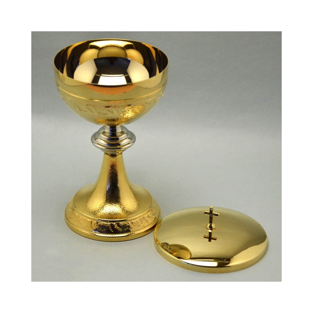 Consegna in 2 settimaneSet composto da calice e pisside in ottone bicolore, con sottocoppa martellata.