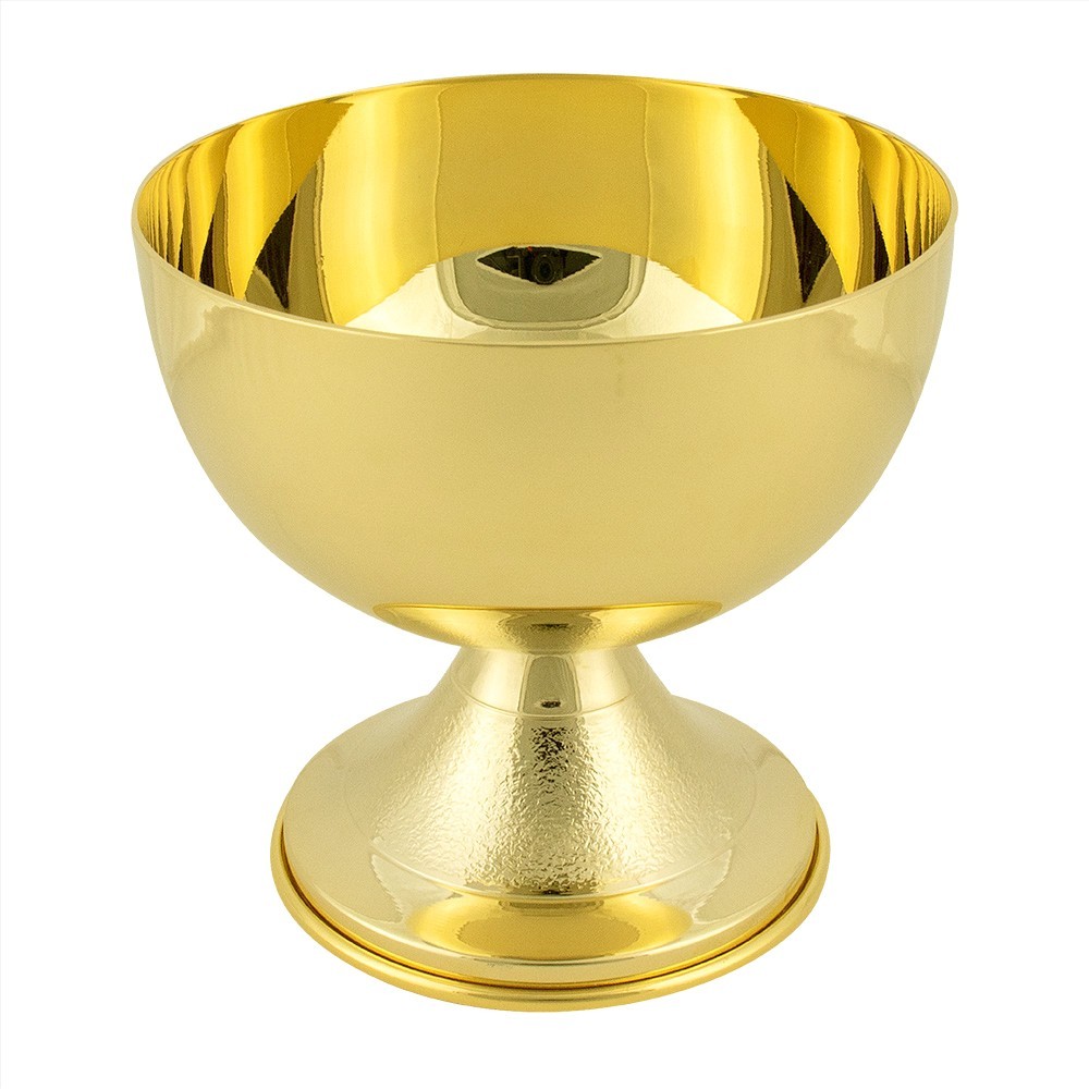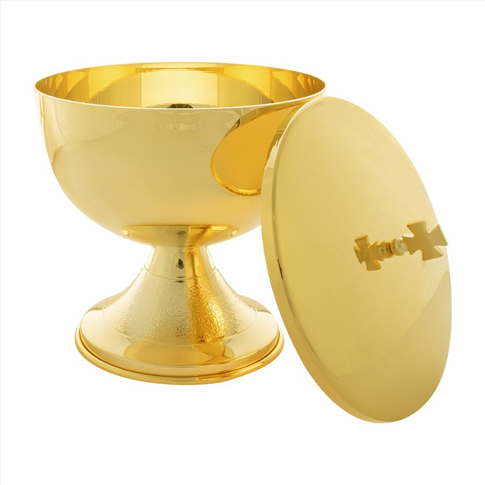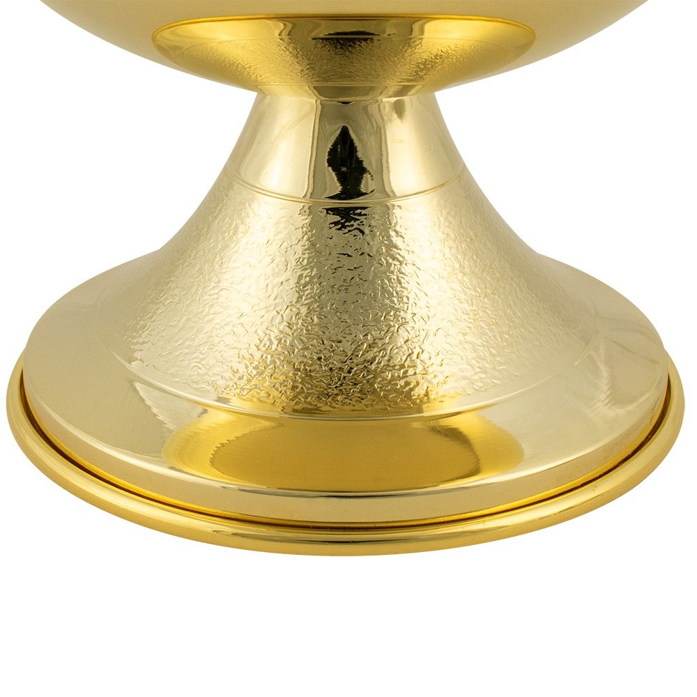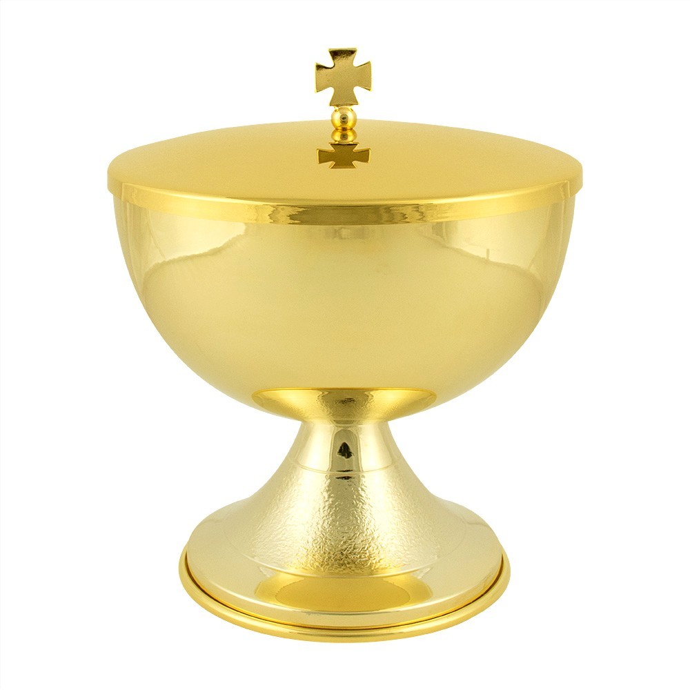 Pisside in ottone dorato con base zigrinata. Doratura 24 carati. La pisside è alta 13,5 cm con coppa 14 cm di diametro. Articolo di ottima qualità, 100% italiano. Corredata di scatola in cartone e copri pisside in tessuto.