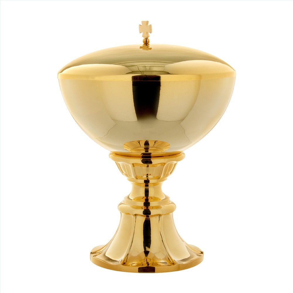 Pisside Magnum per la Concelebrazione, alta 20 cm con coppa grande (Ø 18 cm ca). Questa pisside liturgica dal design classico è realizzata in ottone dorato con doratura 24 carati. Il coperchio è dotato di una piccola croce in ottone. La pisside può contenere circa 600 particole. Prodotto di ottima qualità, 100% italiano.