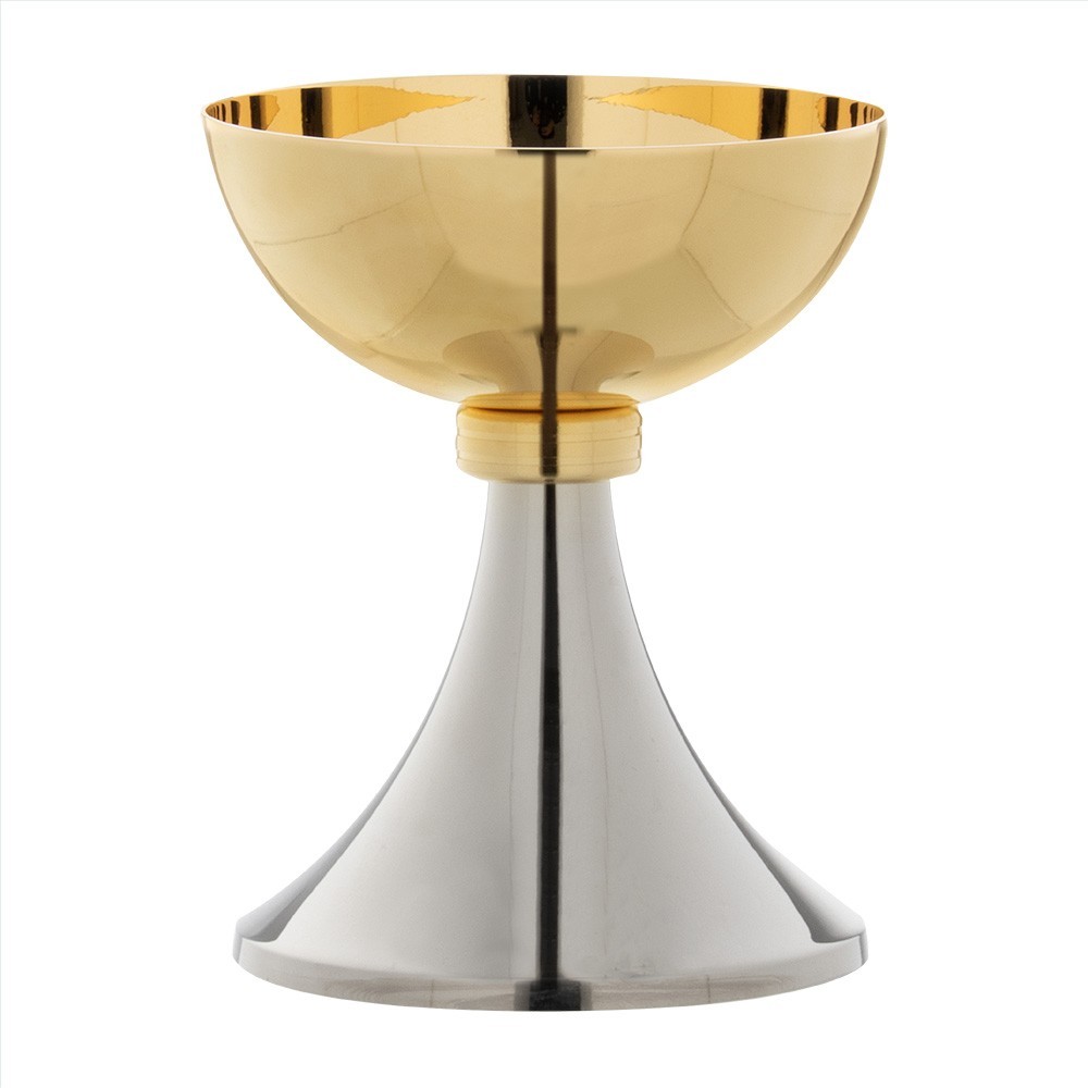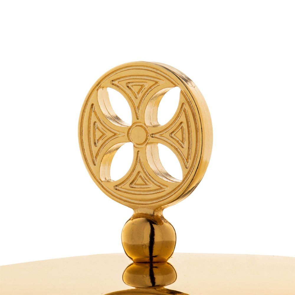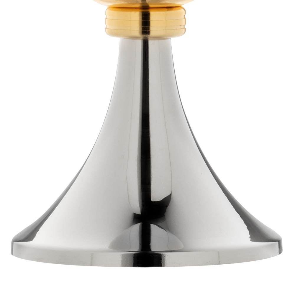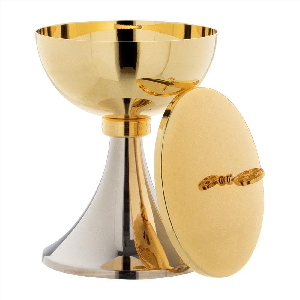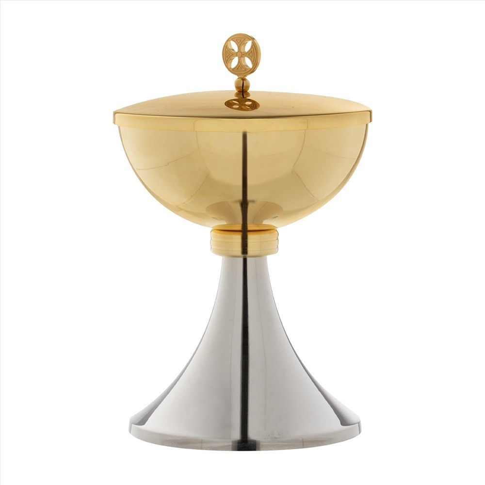 Pisside liturgica in ottone bicolore. La base è ottone argentata e la coppa e il nodo sono in ottone dorato. Ottima la qualità della doratura e della nichelatura che sono durevoli nel tempo. Viene fornito completo di copri pisside.
