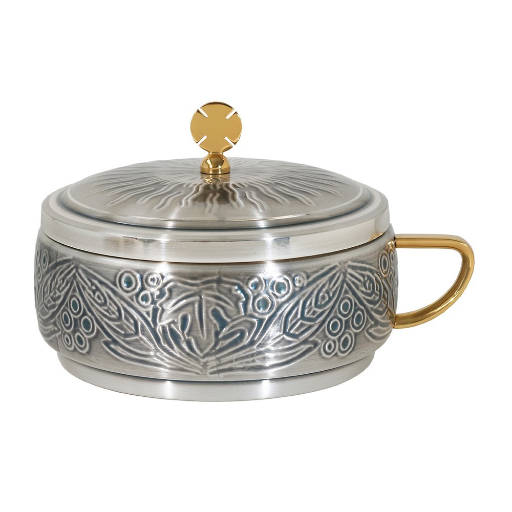 Questa pisside è in metallo finitura argento ed è finemente decorata. Il coperchio presenta una piccola croce, è alta 12 cm e la coppa misura 16 cm di diametro.
