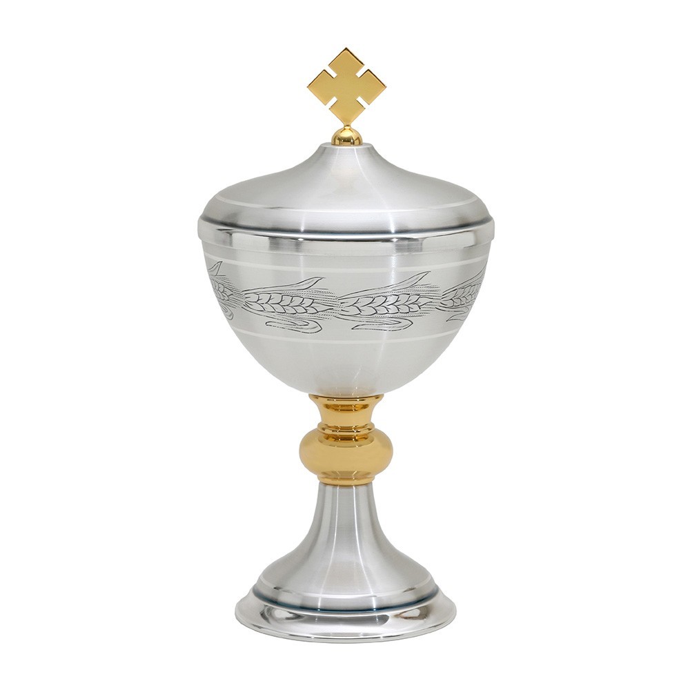Pisside liturgica realizzata in metallo bicolore incisa a cesello. La pisside è alta 26 cm e il diametro della coppa è 13 cm ca. Articolo 100% italiano, prodotto con materiali di prima qualità.