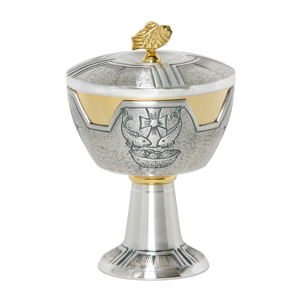 Pisside in ottone bicolore con finiture oro e argento e incisione "Pani e Pesci". Made in Italy.