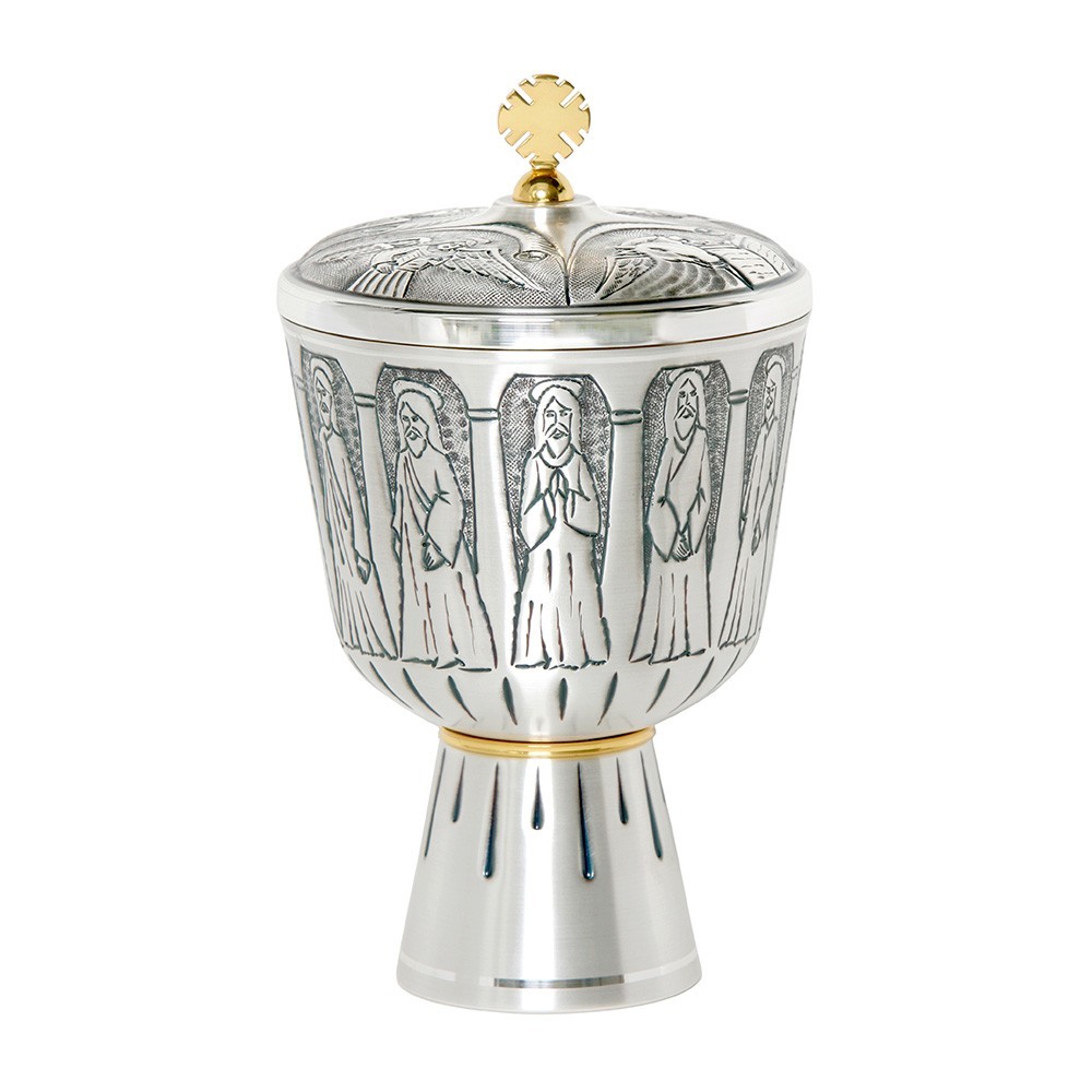 Pisside liturgica in ottone bicolore con finiture argento e dorate, con incisione dei Dodici Apostoli. Articolo di ottima qualità, produzione italiana.