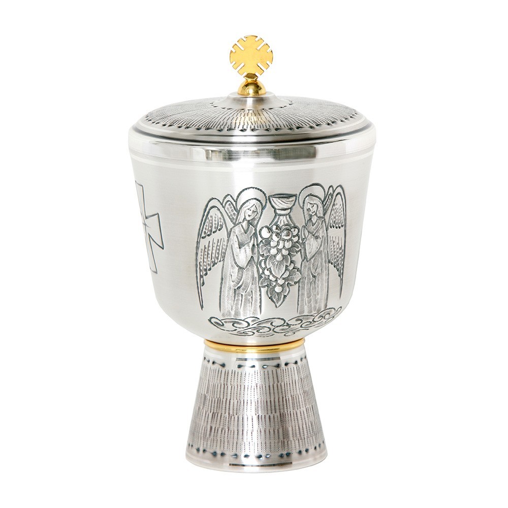 Questa pisside è realizzata in ottone dorato e argentato ed è finemente decorata con Angeli in preghiera. Produzione italiana.