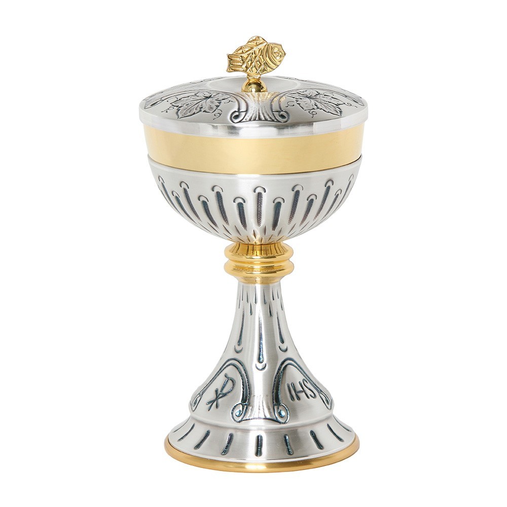 Pisside liturgica in ottone con decori. I graziosi decori incisi sulla pisside raffigurano il simbolo JHS e foglie d'uva. La pisside è alta 22,5 cm e il diametro coppa misura 12 cm. Made in Italy.