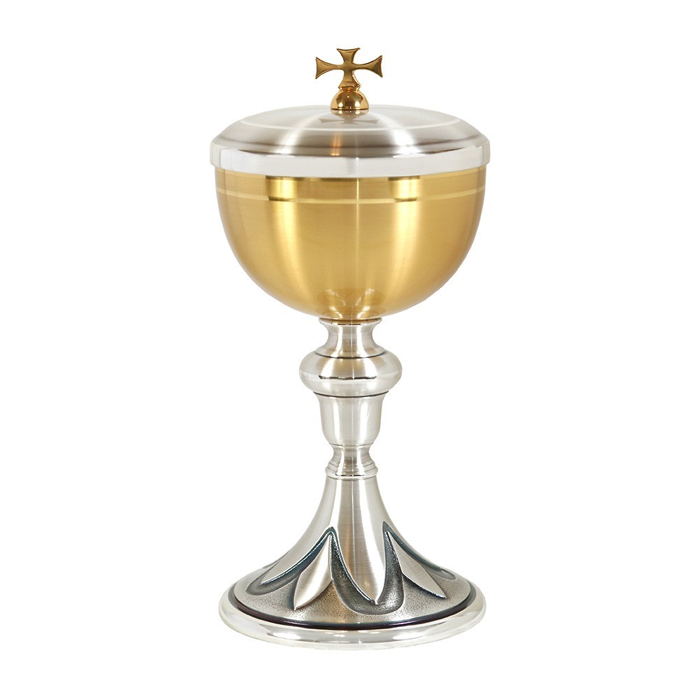 Pisside liturgica in metallo bicolore, realizzata con nodo e base decorata. La base è finemente decorata raffigurante dei petali. La'ltezza della pisside è 21 cm e il diametro coppa è 10 cm. Made in Italy.