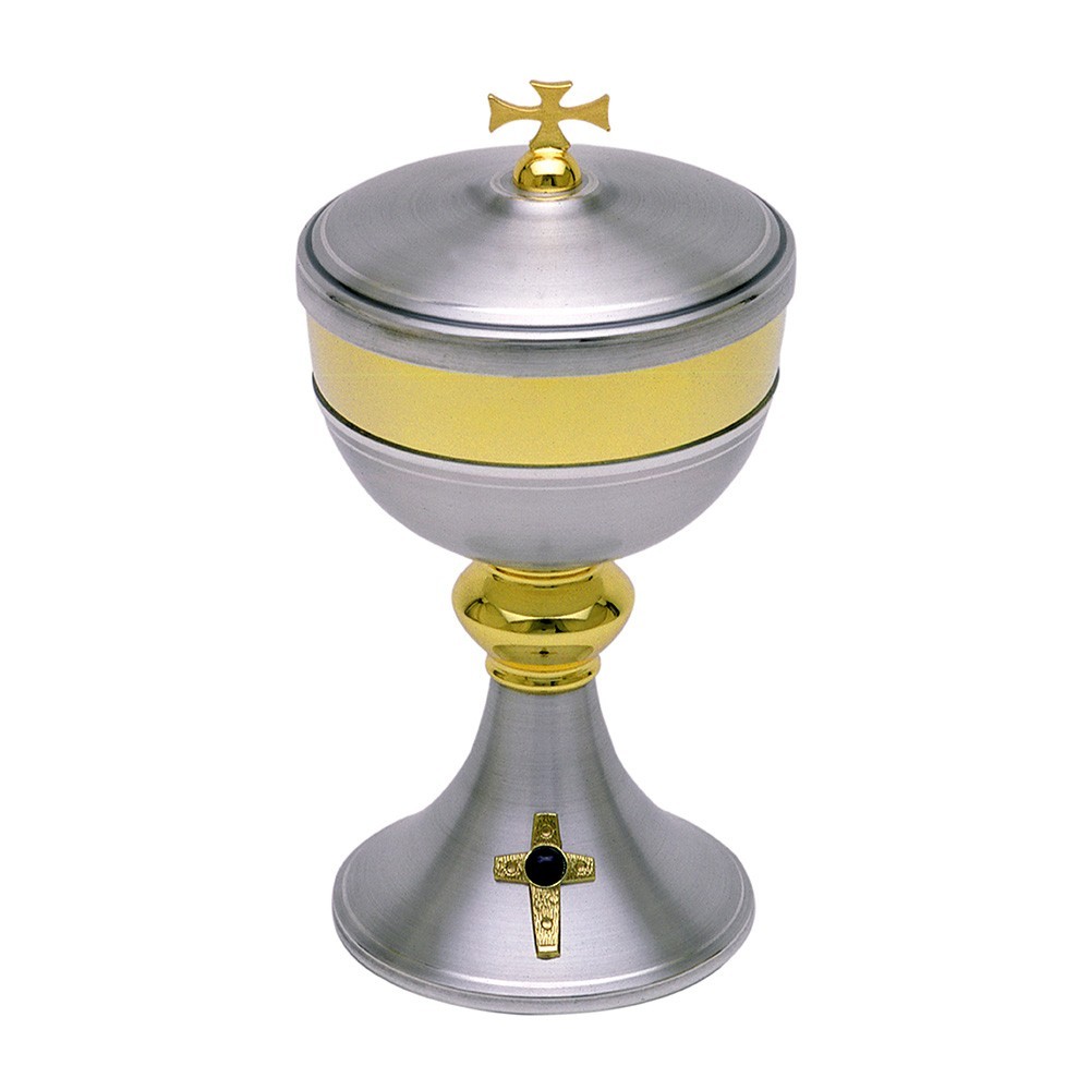 Pisside liturgica in ottone bicolore con finiture argento e dorate, decorata con croce e arricchita con pietra Onice. Articolo di ottima qualità, produzione italiana.
