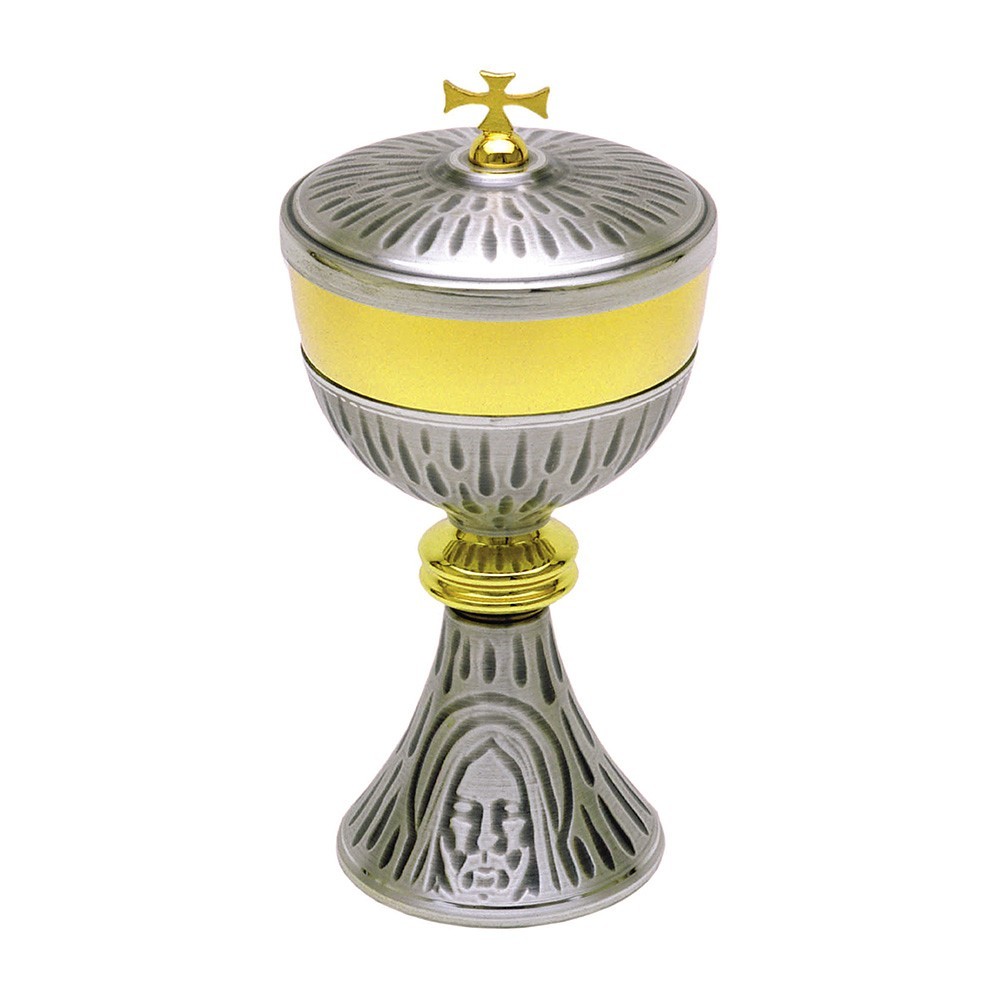 Pisside liturgica in ottone bicolore con finiture argento e dorate, finemente decorata con il Santo Volto di Gesù. Articolo di ottima qualità, produzione italiana.