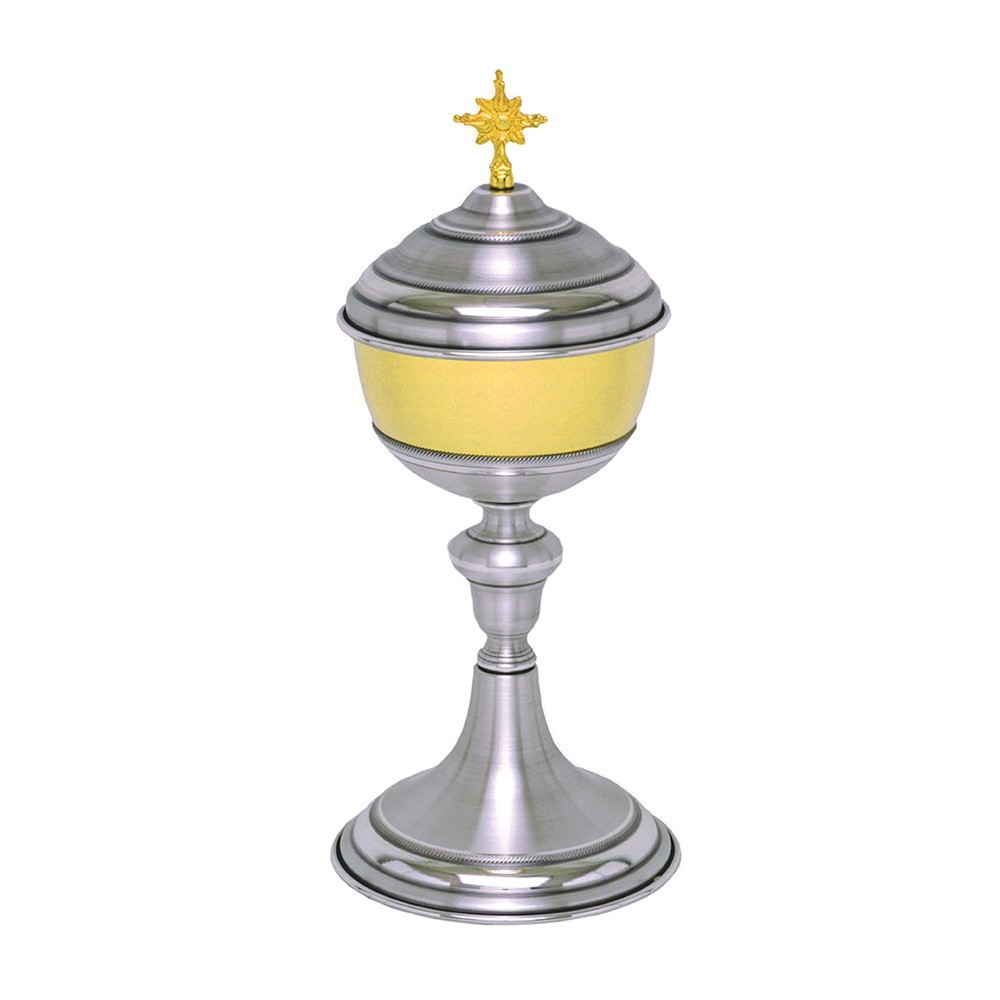 Pisside liturgica in ottone bicolore con finiture oro e argento. La pisside è alta 26 cm e il diametro coppa è 12 cm. Articolo di ottima qualità, produzione italiana.