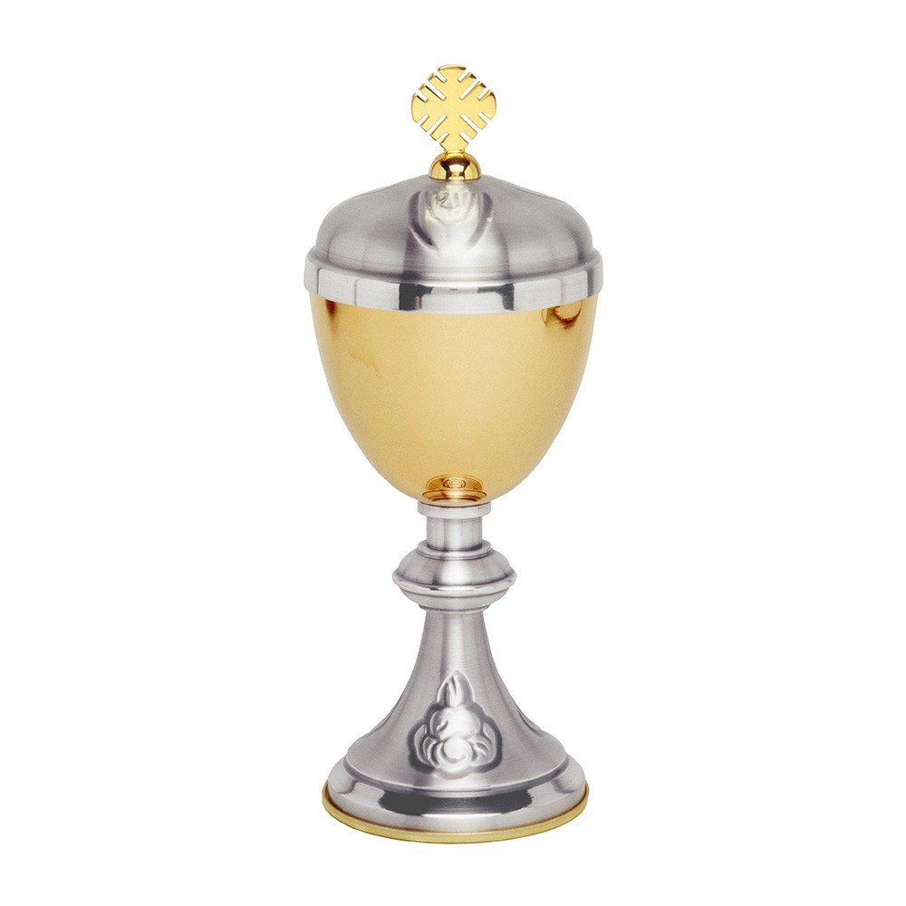 Pisside liturgica in ottone bicolore. La base e il coperchio sono in ottone argentato, mentre la coppa e il nodo sono in ottone con finitura oro. L'altezza della pisside è 19,5 cm e il diametro coppa 8 cm. Articolo di ottima qualità, produzione italiana.