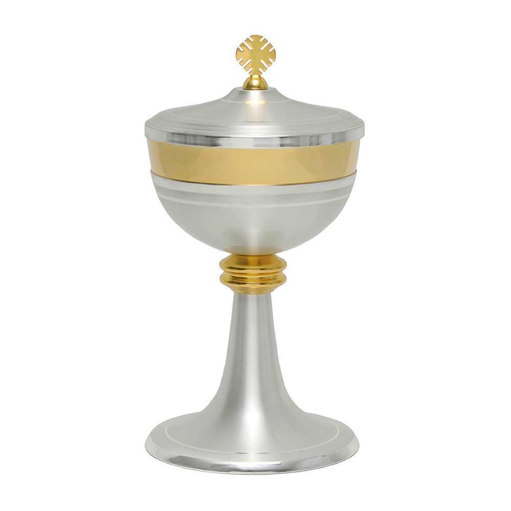 Realizzata interamente in ottone bicolore oro e argento. L'altezza della pisside è 23 cm e il diametro della coppa è 12 cm. Articolo di ottima fattura eseguito da una ditta italiana di arredi sacri, utilizzando materiali di prima scelta.