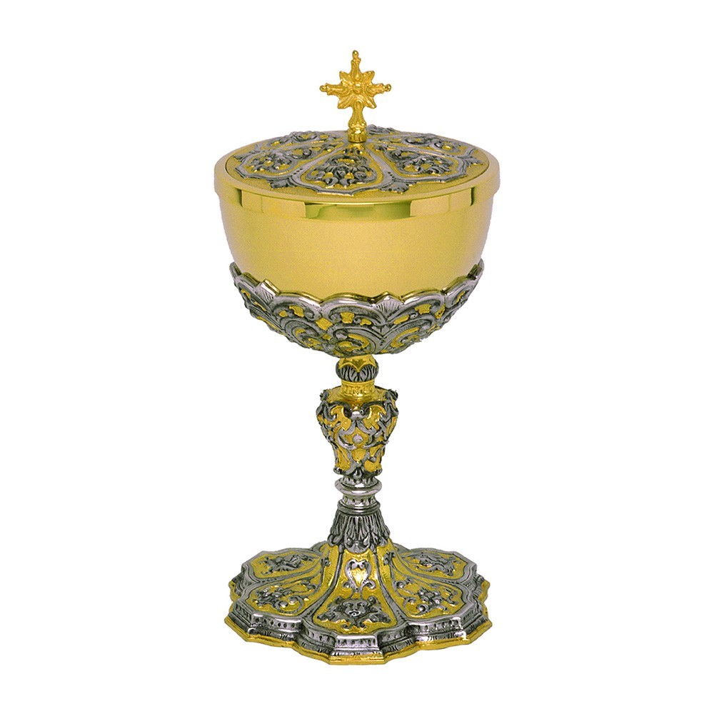 Pisside liturgica in ottone bicolore con finiture argento e dorate, finemente decorata. Articolo di ottima qualità e di particolare bellezza grazie alla lavorazione eseguita da esperti artigiani italiani.