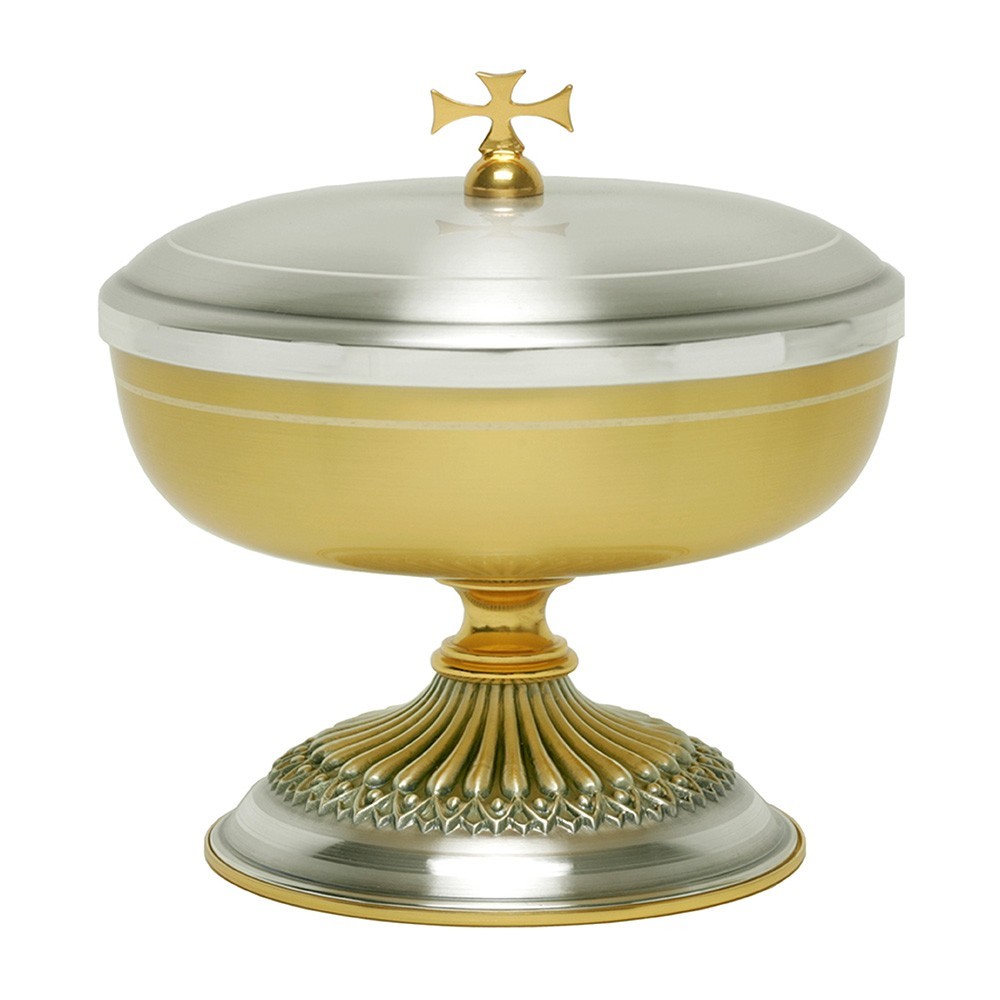 Pisside bassa in ottone bicolore con base finemente cesellata. La pisside è alta 14 cm e il diametro della coppa è 14 cm. Articolo di ottima qualità, prodotto interamente da un'azienda italiana.