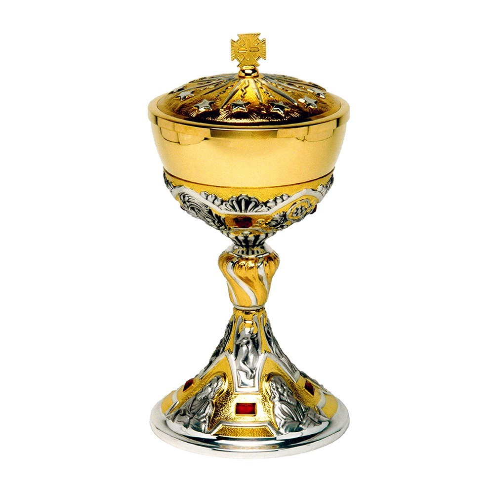Set calice e pisside con nodo decorato di pietre rosse incastonate.