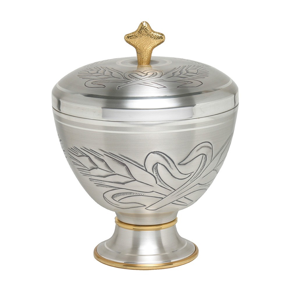 Questa bellissima pisside liturgica è realizzata in ottone bicolore con finiture argento e dorato, finemente cesellata a mano con spighe di grano. L'altezza della pisside è 17 cm e il diametro della coppa è 13 cm. Prodotta da un'azienda italiana garantedo materiali di prima scelta e la massima cura nei particolari.
