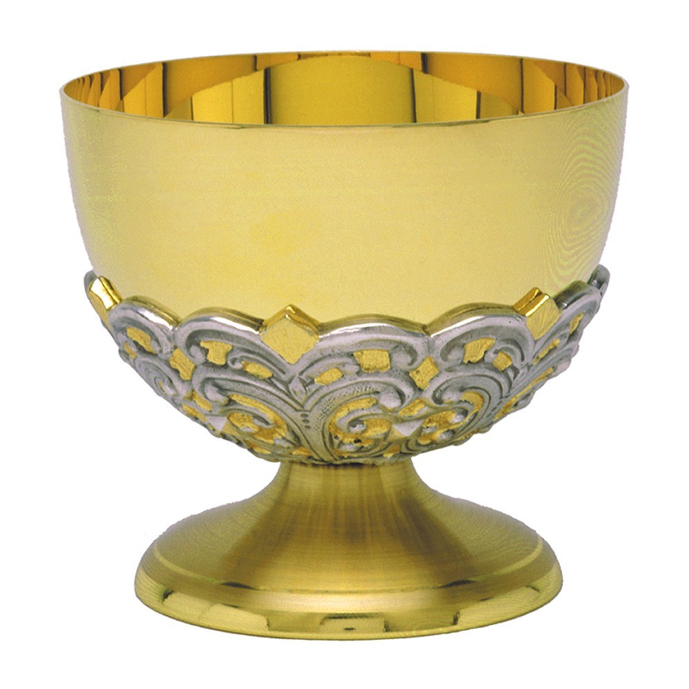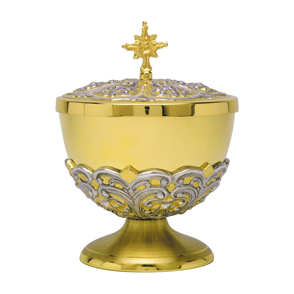 Pisside liturgica in ottone dorata. Presenta decori stilizzati sulla coppa e sul coperchio. L'interno della pisside è in ottone dorato. Articolo di ottima qualità eseguito da un'azienda italiana.