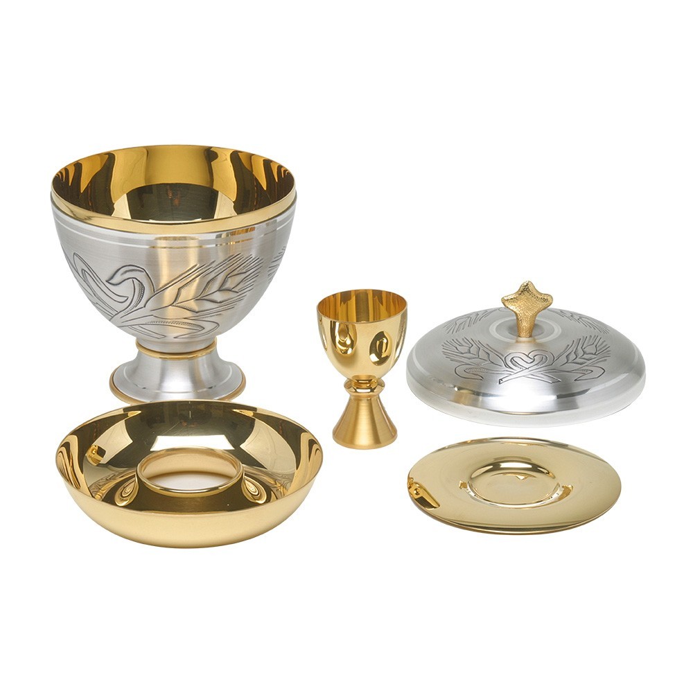 Pisside comunione sotto le due specie. Articolo liturgico realizzato in ottone bicolore oro e argento, cesellato finemente a mano raffigurante spighe di grano. L'interno della coppa è in ottone dorato. La pisside è completa di calice e patena, l'interno è estraibile.