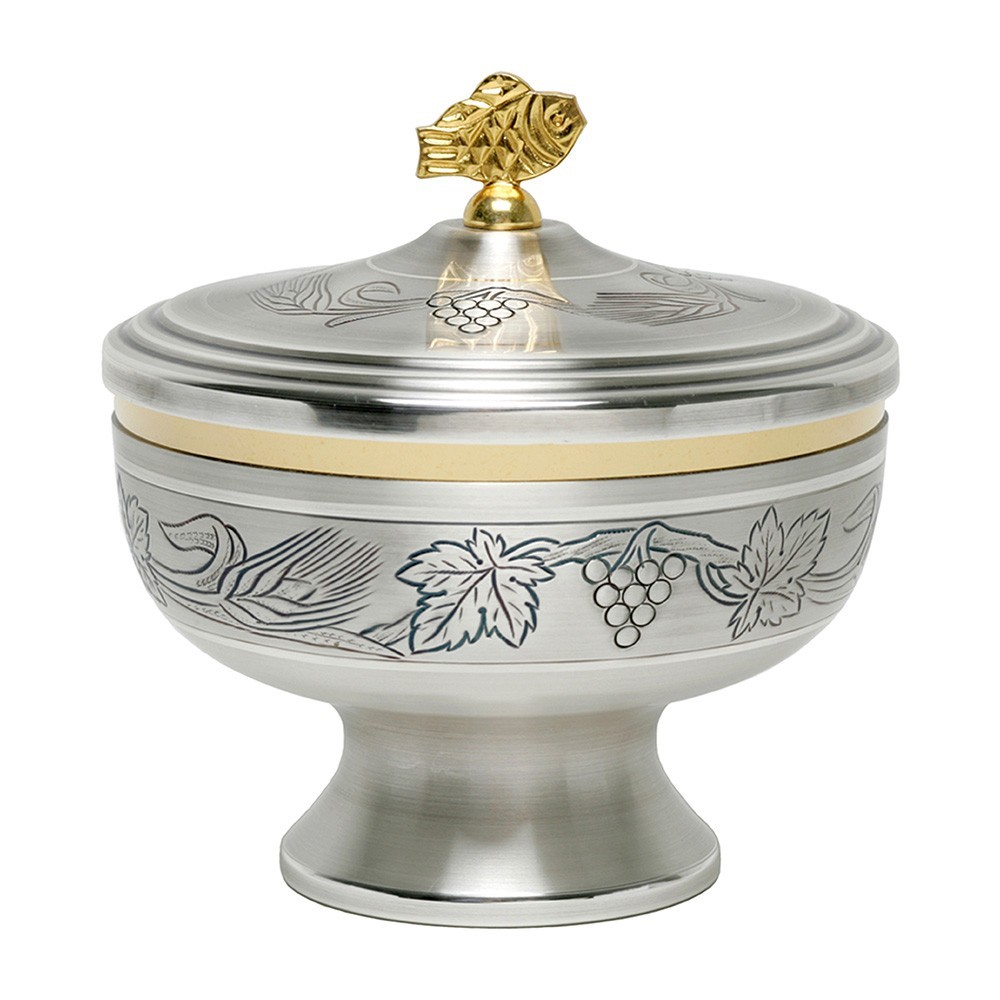 Pisside liturgica in ottone con coppa e coperchio incisa a cesello. Articolo di particolare bellezza grazie alla lavorazione eseguita da esperti artigiani italiani.