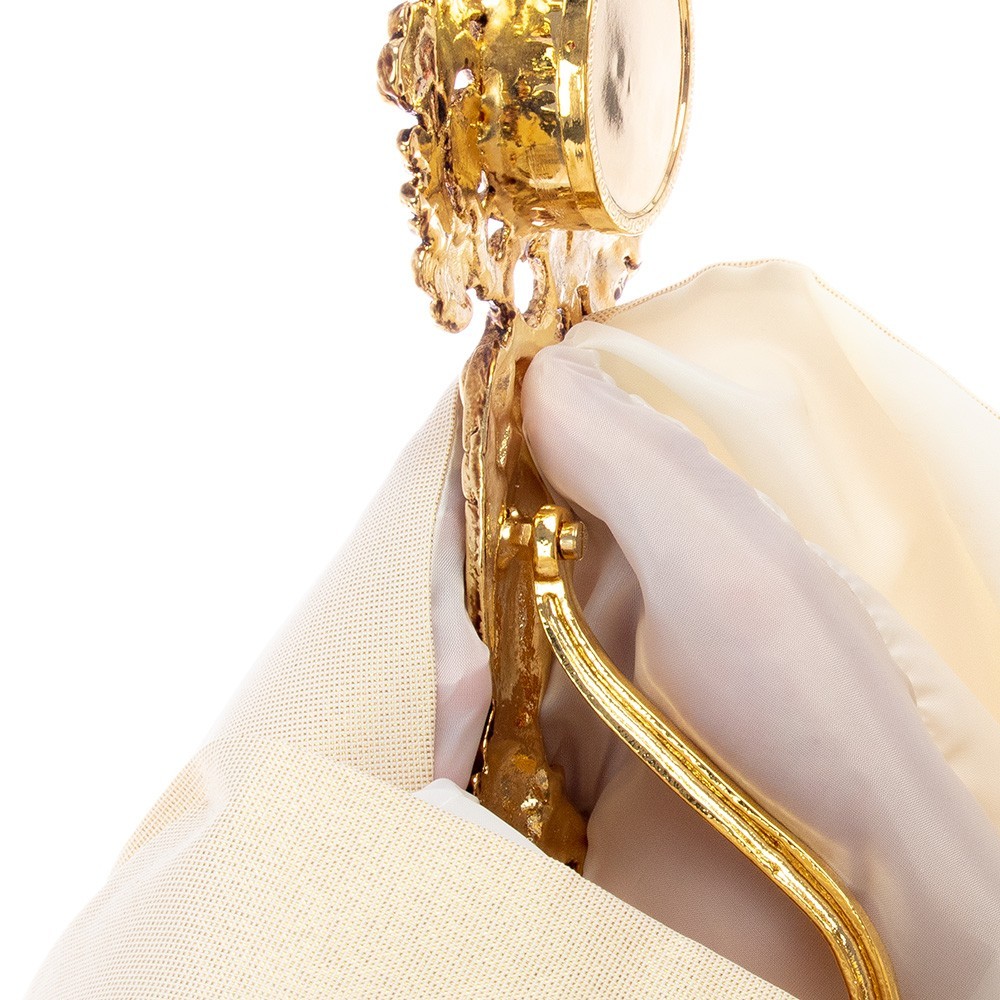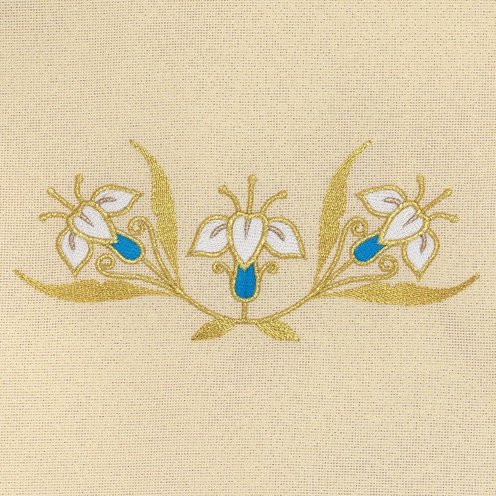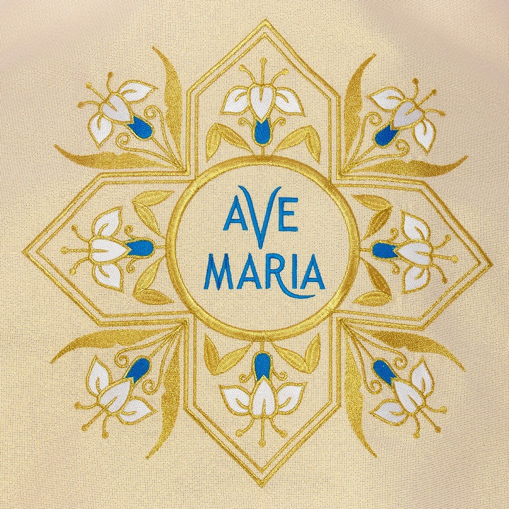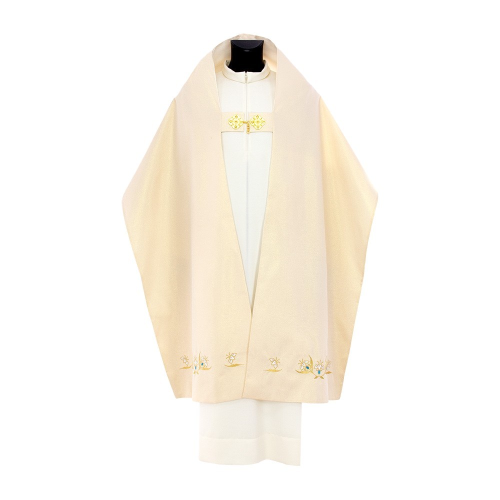 Questo paramento sacro è finemente ricamato a macchina confezionato in elegante e fresco tessuto in poliestere. I filati utilizzati per il ricamo sono di colore blu e argento. Viene fornito di ganci in ottone dorato per poterlo abbottonare e tasche all'interno.