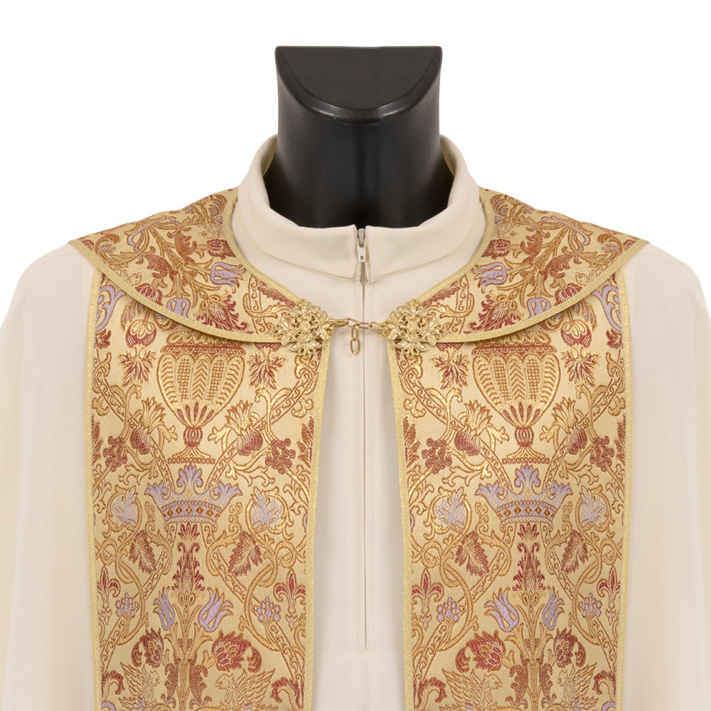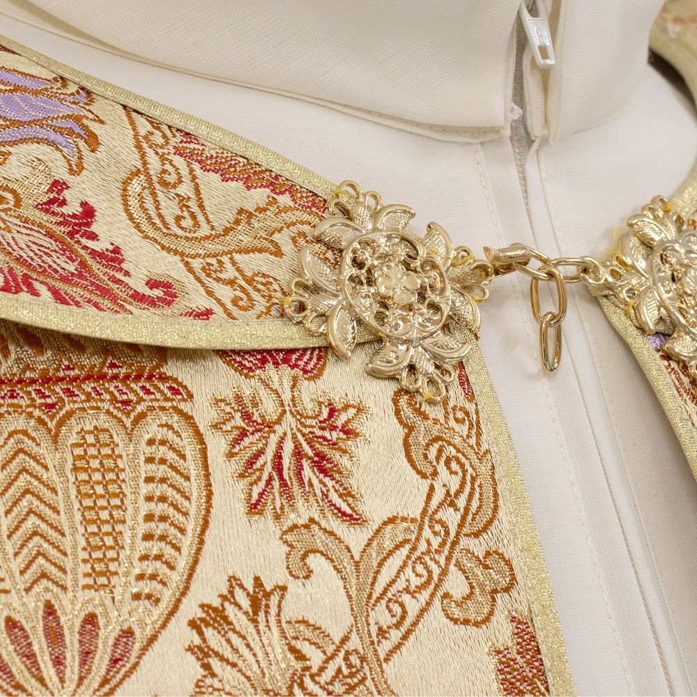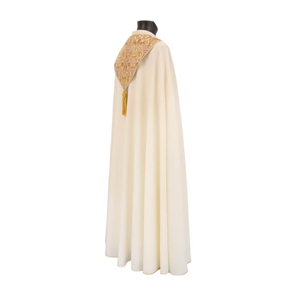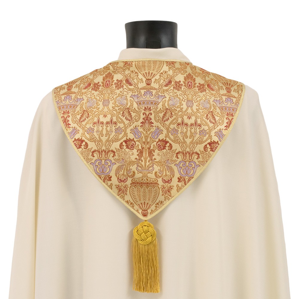 Il paramento è realizzato in pregiato tessuto pura lana, mentre gli stoloni e il cappino sono in elegante lampasso.