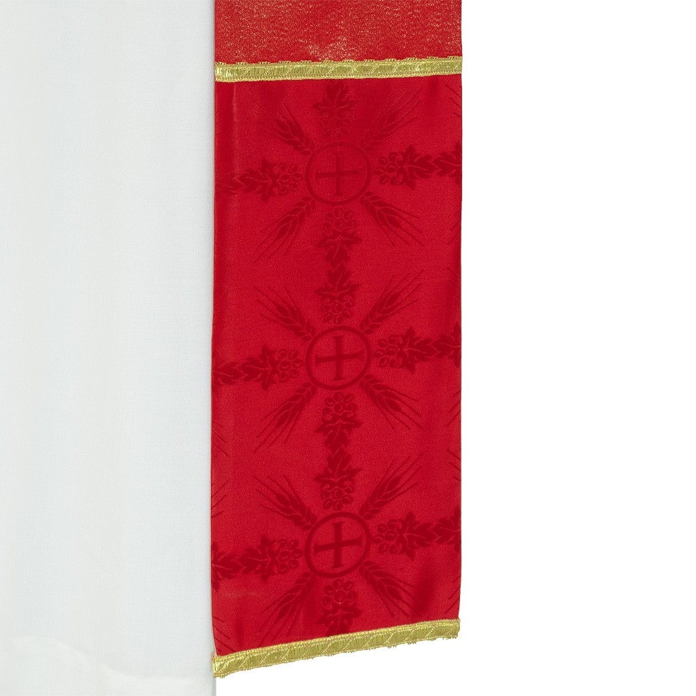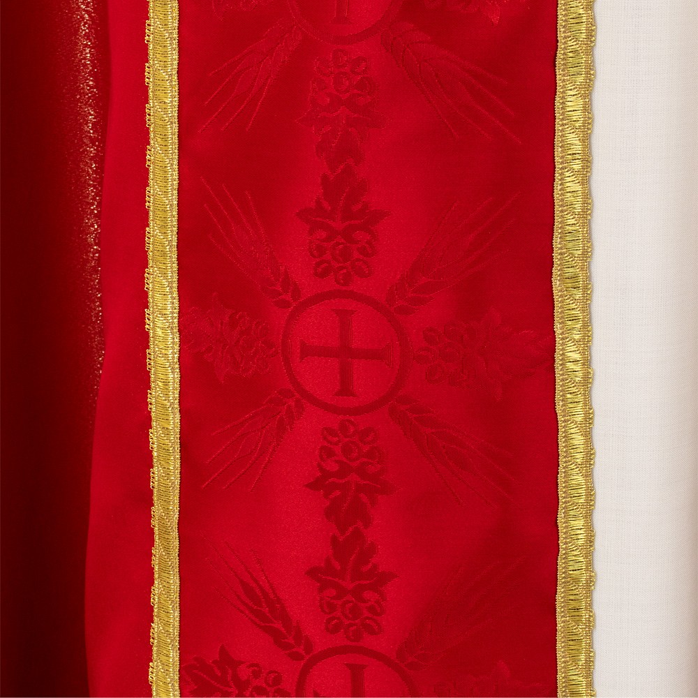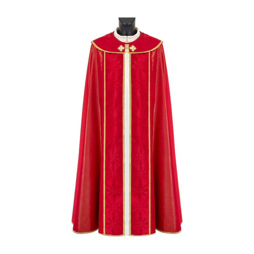 Piviale sacerdotale rosso confezionato in leggero tessuto misto acetato e poliestere, mentre gli stoloni e il cappino sono in elegante tessuto damascato.