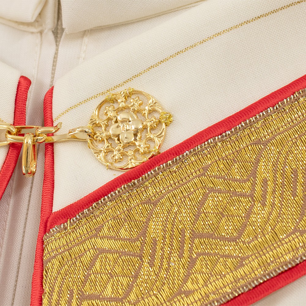 Lungo tutto il profilo del piviale vi è uno sbieco rosso che rifinisce tutte le cuciture.