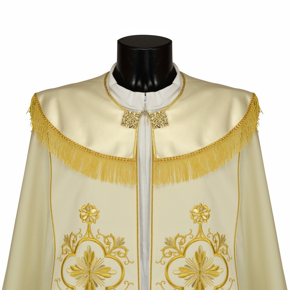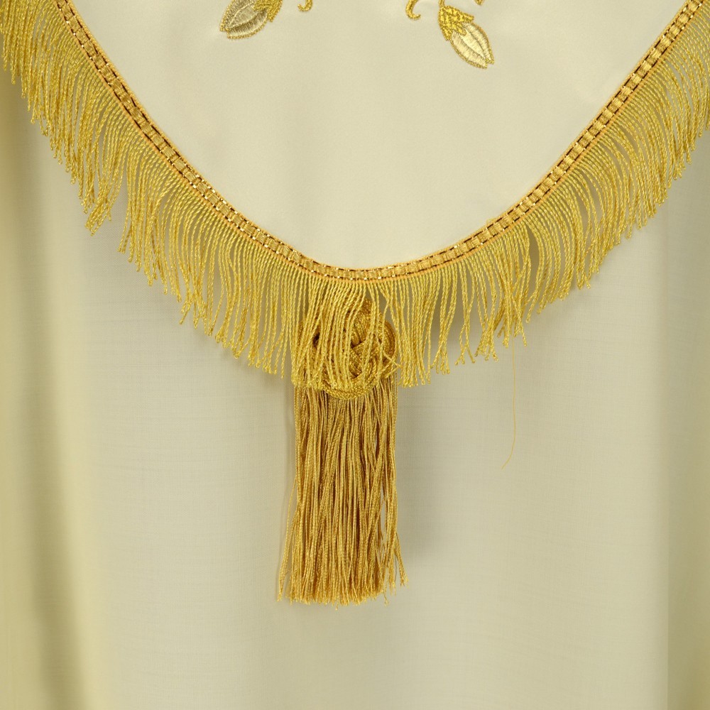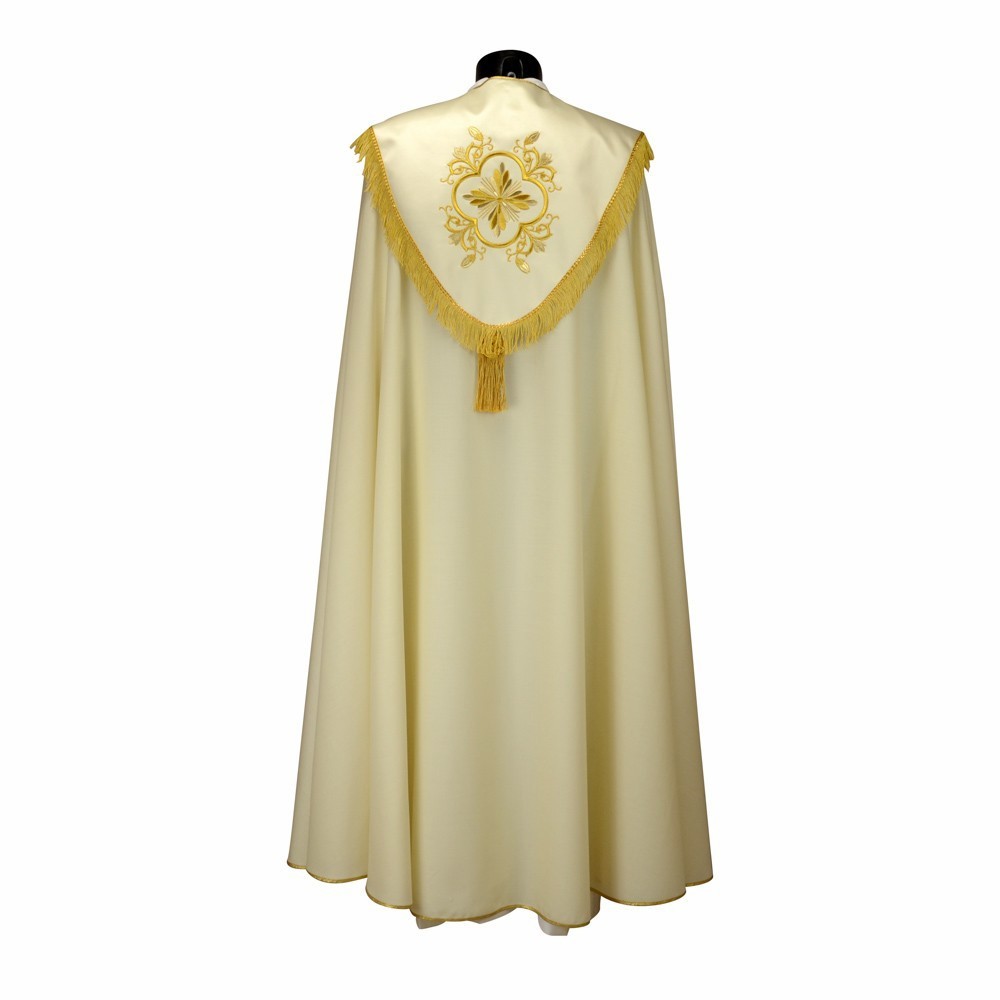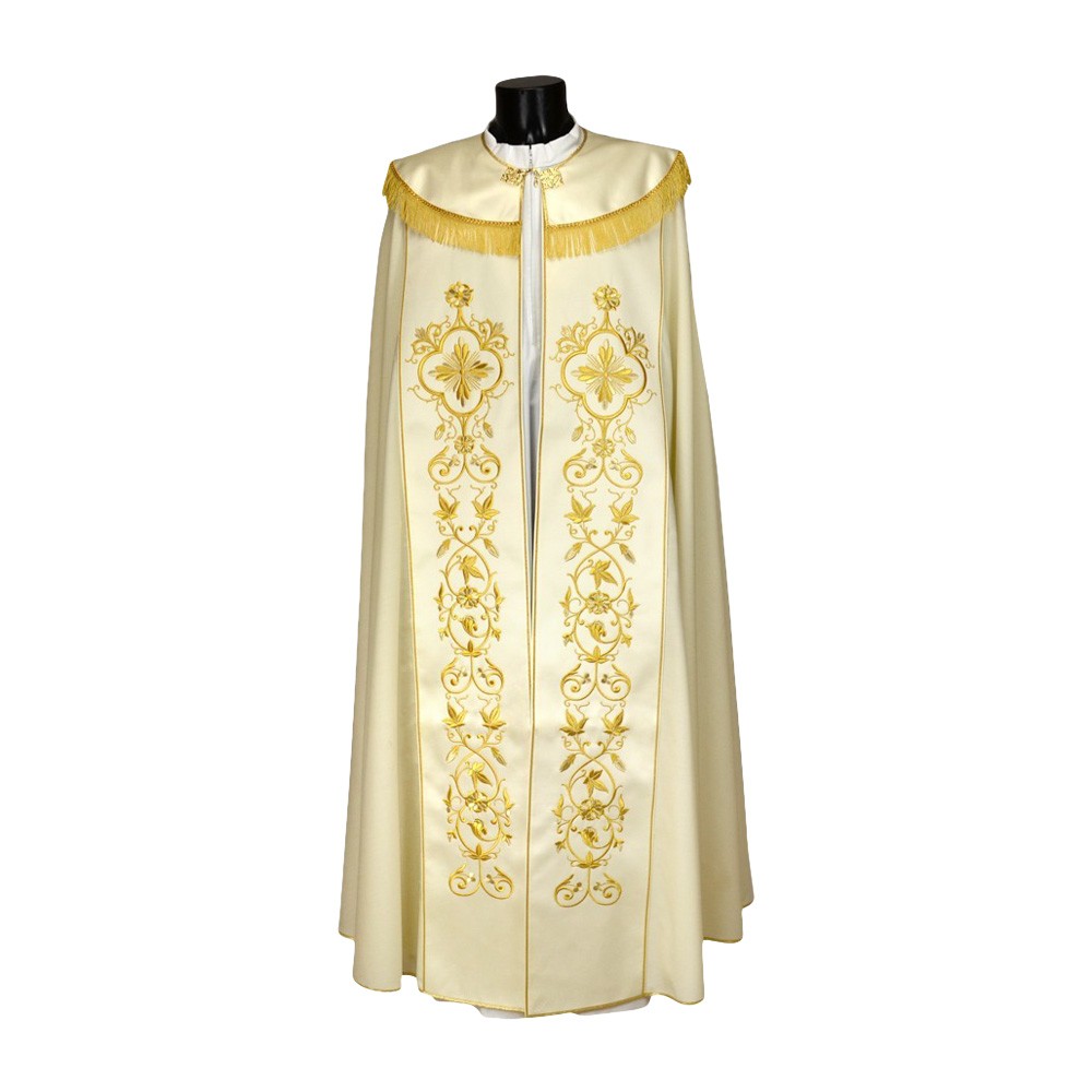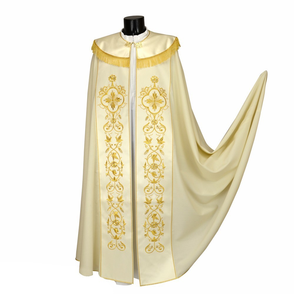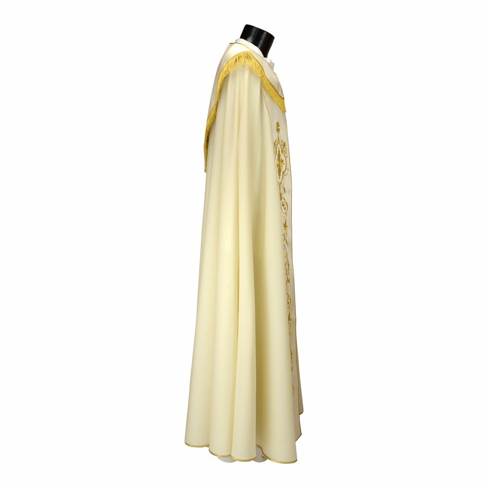 Piviale Sacerdotale con ricco ricamo dorato a macchina. Questo grazioso paramento è in tessuto pura lana con stoloni in raso. Cappino ricamato e rifinito con frangia dorata e fiocco rebur.