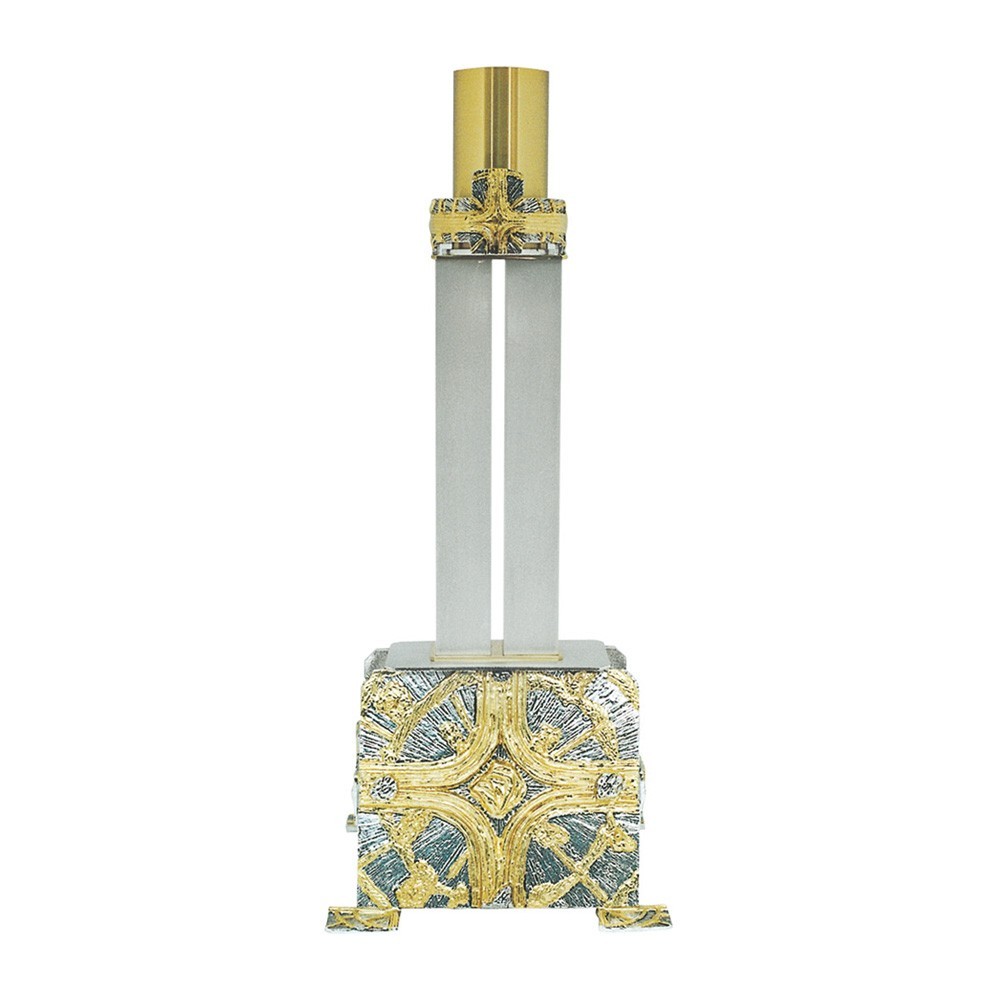 Questa base per cero pasquale è un arredo sacro, decorato con una croce dorata e raggiata su sfondo argentato.