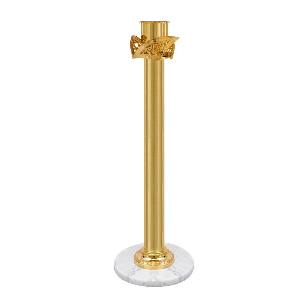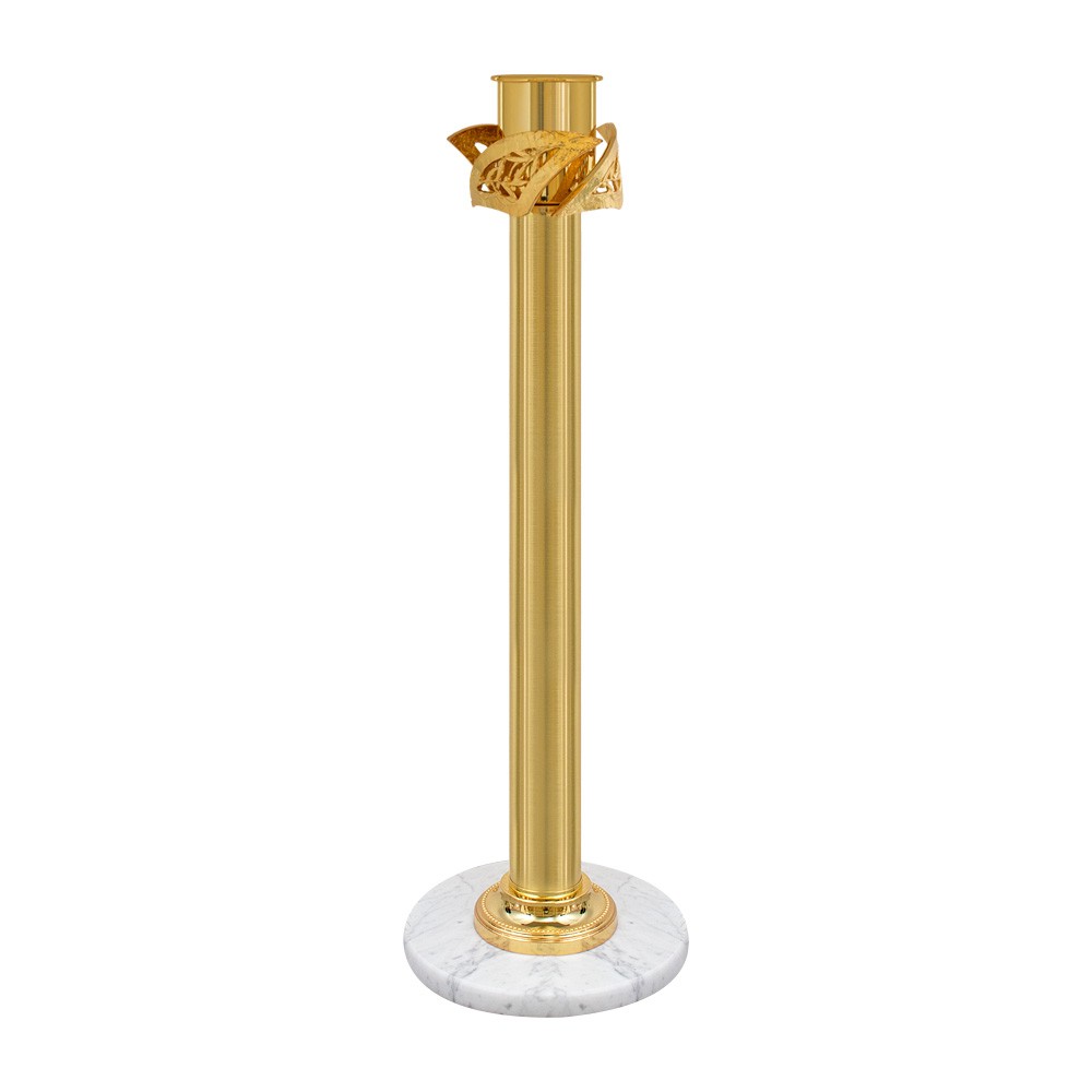 Questa base per cero pasquale è in ottone con finitura oro e base in marmo chiaro.