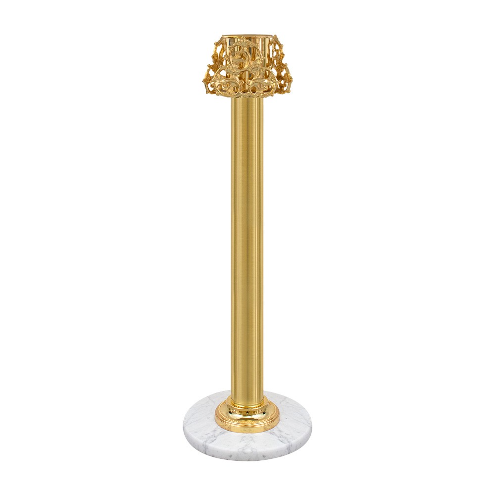 Questa base portacero pasquale è interamente in ottone con finitura oro e base in marmo chiaro.