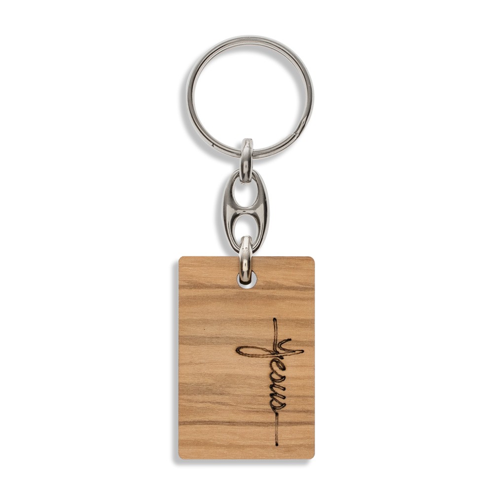 Portachiavi con gancio in metallo e placchetta JESUS in legno chiaro.