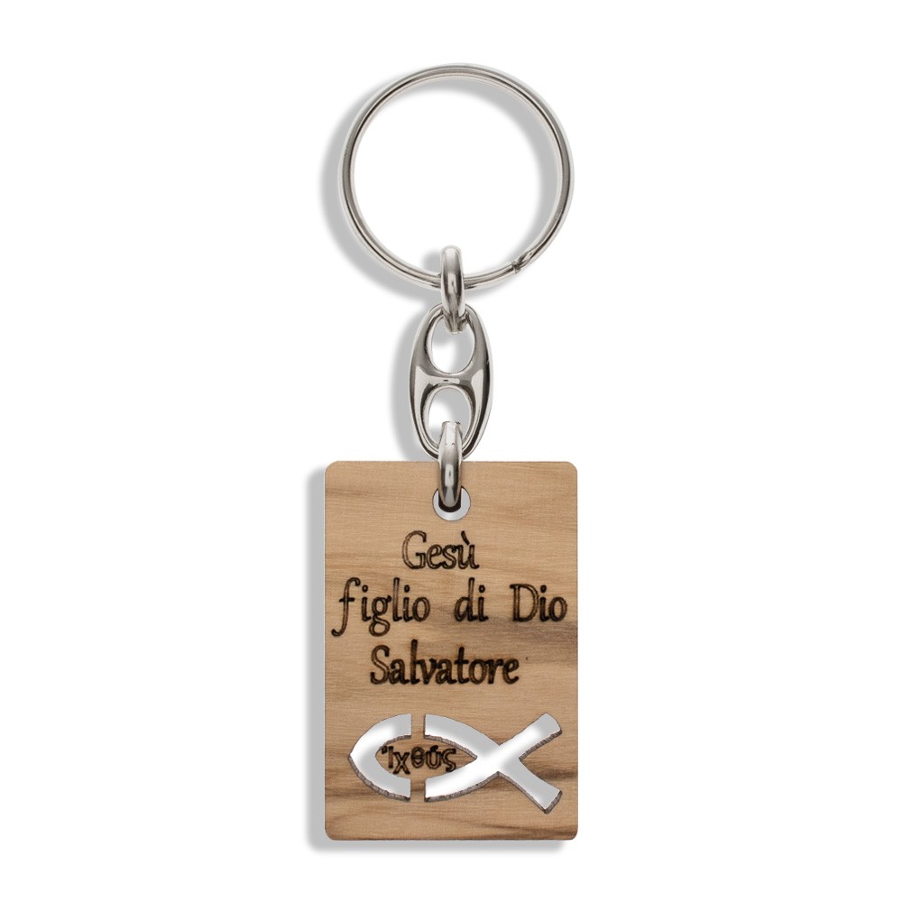 Portachiavi in legno intagliato con immagine del pesce e scritta incisa a laser "Gesù figlio di Dio Salvatore".
