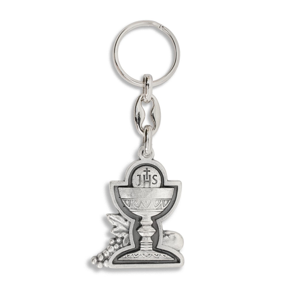 Portachiavi Prima Comunione a forma di mini calice con grappoli d'uva e pane.