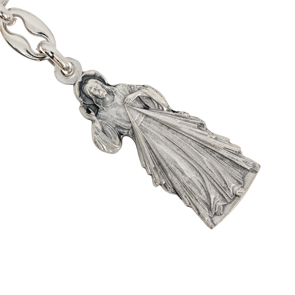 Portachiavi a forma di mini statua di Gesù Misericordioso, realizzato con gancino ad anello interamente in metallo tono argento.