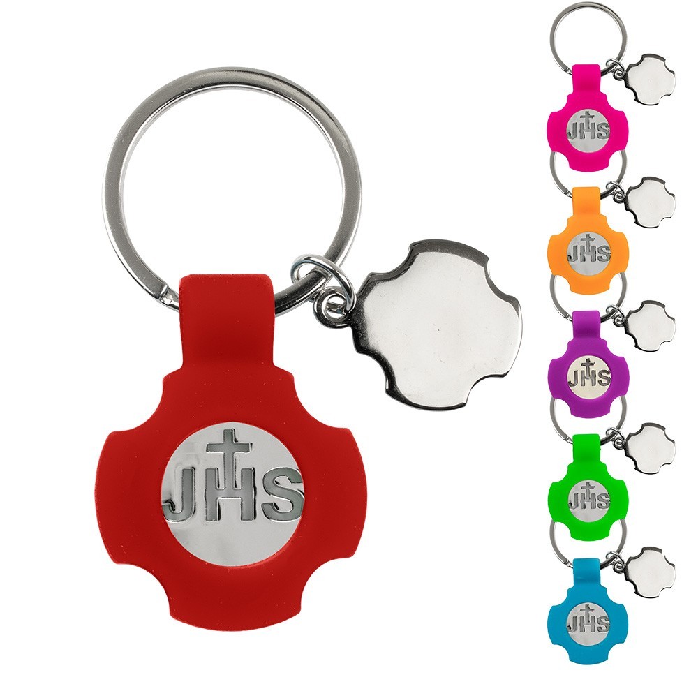 Portachiavi gommosi con gettone JHS. Il portachiave è realizzato in gomma colorato e metallo a forma di croce. All'interno del portachiavi vi è un gettone utilizzabile per il carrello della spesa. Carinissima idea regalo. Disponibile nei colori assortiti. Imbustato singolarmente. Prodotto made in Italy.