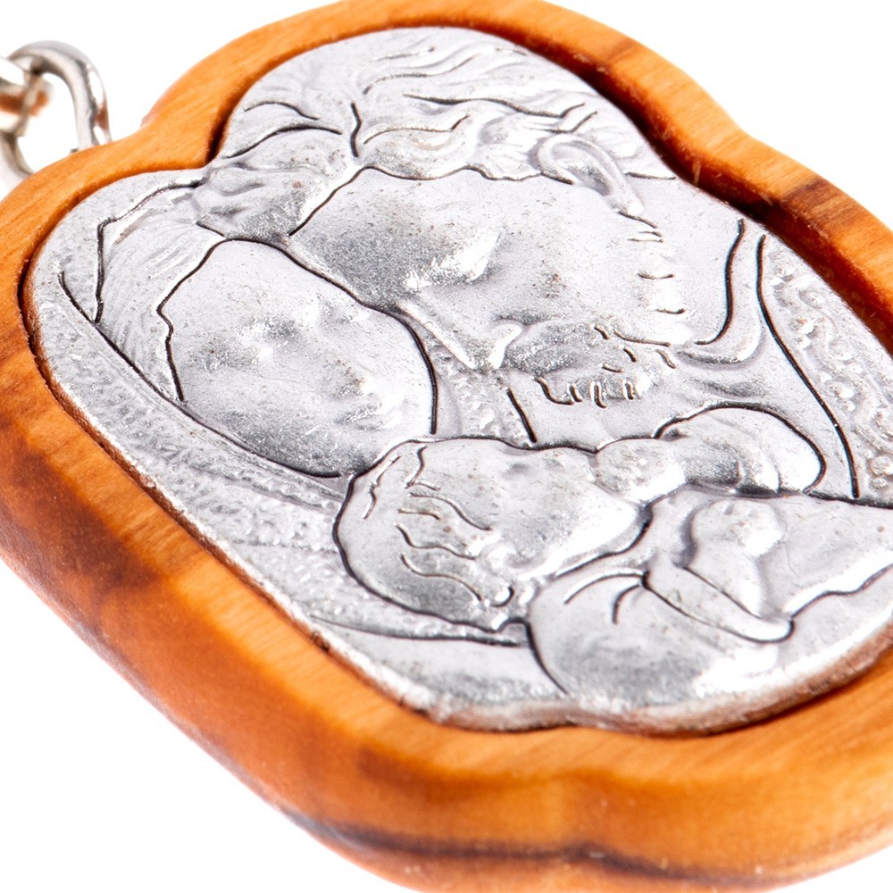Portachiavi in legno d'ulivo e placca in metallo raffigurante una Sacra Famiglia.