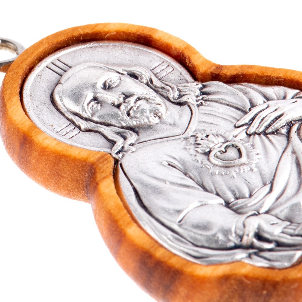 Portachiavi sagomato realizzato in legno d'ulivo con placca in metallo raffigurante In rilievo Sacro Cuore di Gesù.