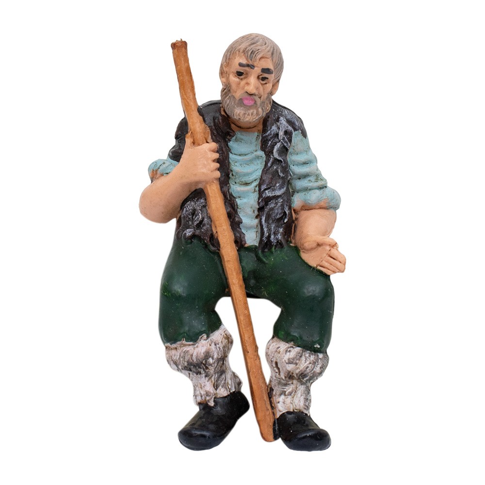 Anziano seduto con bastone presepe Euromarchi, proporzionato per i 10 cm.
